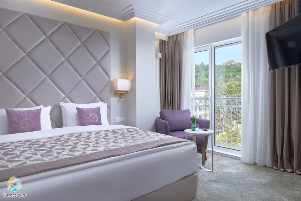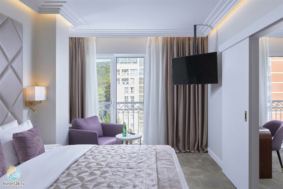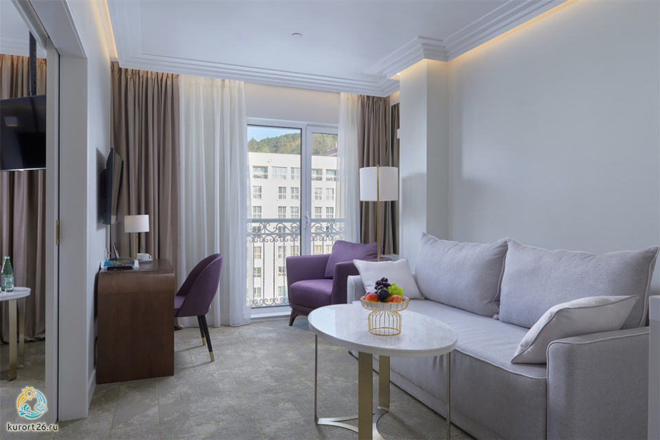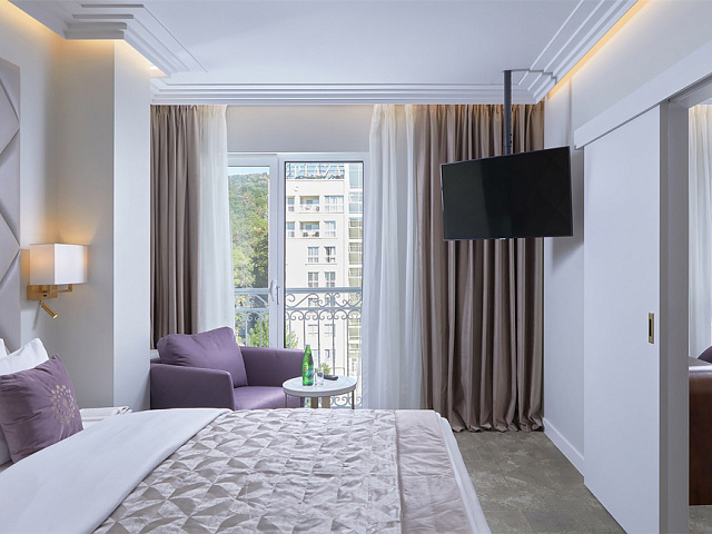Номер состоит из гостиной и спальной комнат. В спальной комнате большая двуспальная кровать, в гостиной — раскладывающийся двуспальный диван.