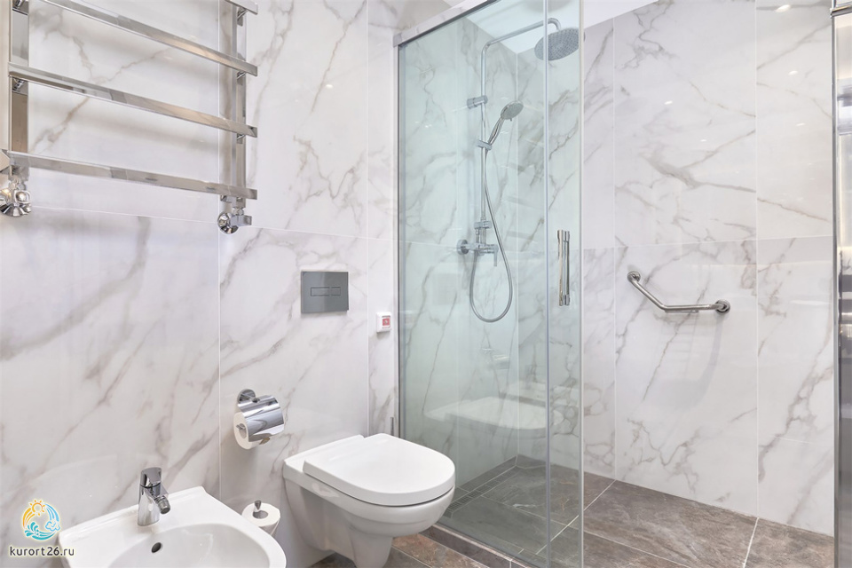 холодильник, кондиционер, телевизор, фен, набор чайной посуды, сейф, душ, телефон, интернет в номере, мини-бар, ванные принадлежности, халат, тапочки, электрочайник, кнопка вызова медперсонала, набор косметических средств, кухонное оборудование, три ванные комнаты с ванной и душевой кабиной, чайный набор