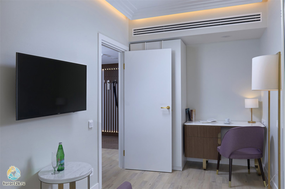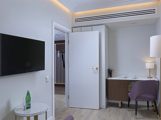 холодильник, кондиционер, телевизор, чайник, фен, набор чайной посуды, сейф, душ, телефон, интернет в номере, мини-бар, халат, тапочки, электрочайник, кнопка вызова медперсонала, набор косметических средств, спутниковые каналы, две ванные комнаты с душевой кабиной