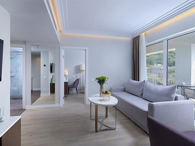 кондиционер, телевизор, фен, набор чайной посуды, сейф, телефон, интернет в номере, мини-бар, санузел с душевой кабиной, тапочки, двуспальная кровать, диван, электрочайник, халаты, набор косметических средств