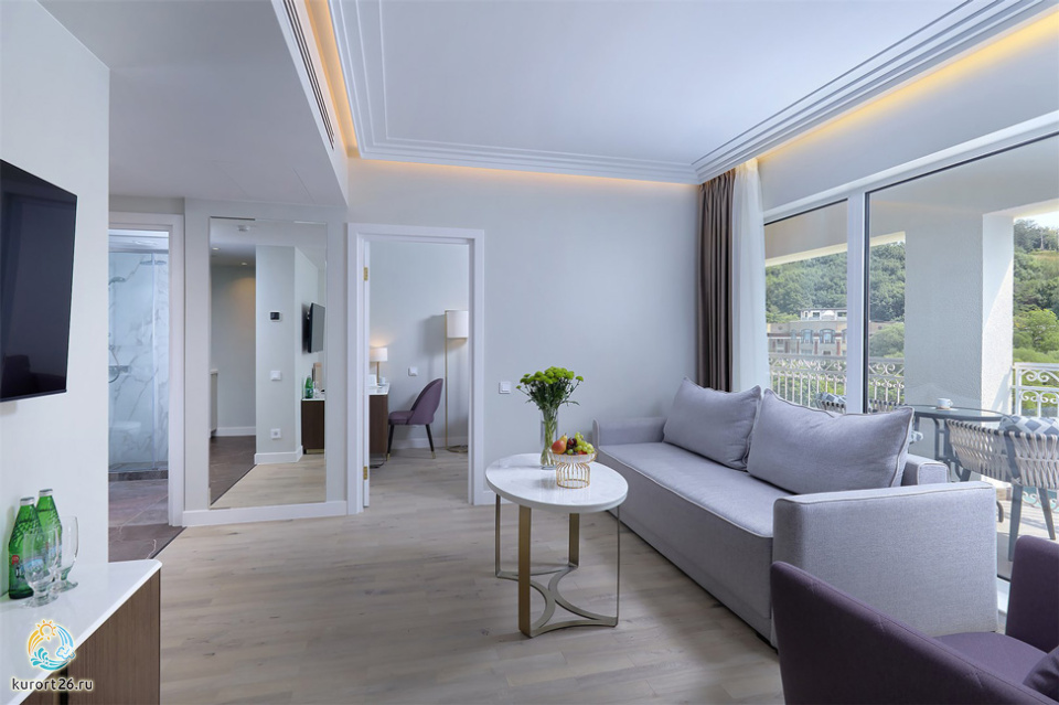 Номер состоит из гостиной и спальной комнат. В спальной комнате большая двуспальная кровать с ортопедическим матрасом, в гостиной — раскладывающийся двуспальный диван.