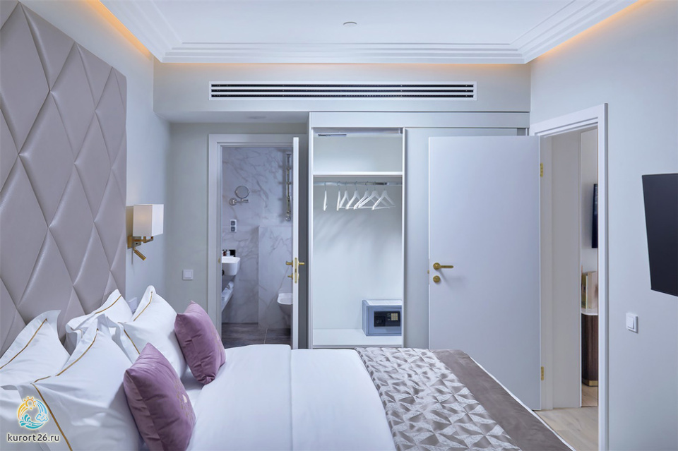 холодильник, кондиционер, телевизор, фен, набор чайной посуды, сейф, душ, телефон, интернет в номере, мини-бар, ванные принадлежности, халат, тапочки, электрочайник, кнопка вызова медперсонала, две ванные комнаты, спутниковые каналы, чайный набор