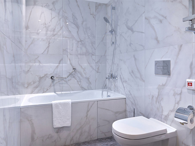 холодильник, кондиционер, телевизор, чайник, фен, набор чайной посуды, сейф, душ, телефон, интернет в номере, мини-бар, ванные принадлежности, халат, тапочки, кнопка вызова медперсонала, набор косметических средств, спутниковые каналы, две ванные комнаты с душевой кабиной