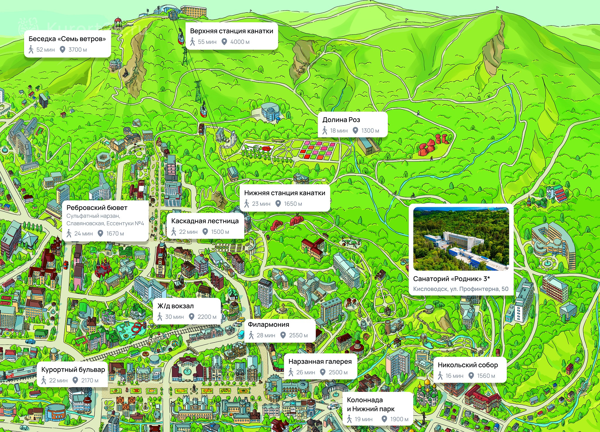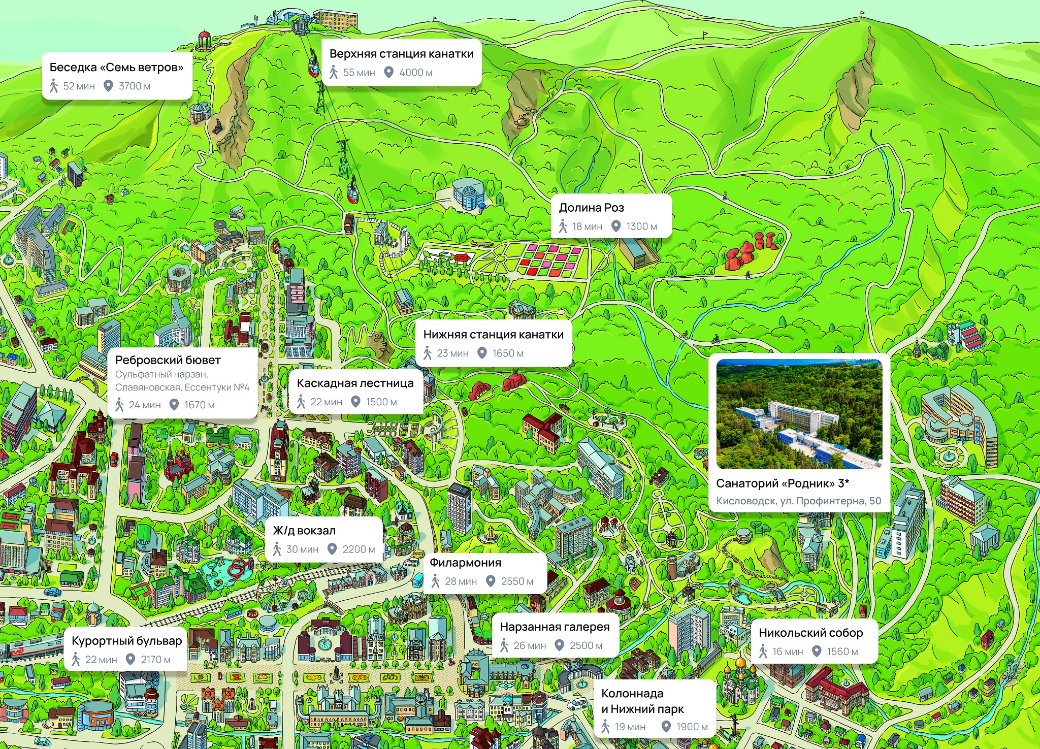 Санаторий «Родник» в Кисловодске — одна из крупнейших многопрофильных здравниц России с 40-летним опытом работы. Расположен в живописном уголке Кисловодского парка, в окружении леса, что обеспечивает тишину, чистый воздух и единение с природой. Из окон всех номеров открывается вид на лес, рядом находится смотровая площадка с панорамными видами. Всего в 15–20 минутах ходьбы вниз — знаменитые «Стеклянная струя», Колоннада, Нарзанная галерея, вверх — канатная дорога и Долина роз. До Курортного бульвара ходит прямой автобус № 15.