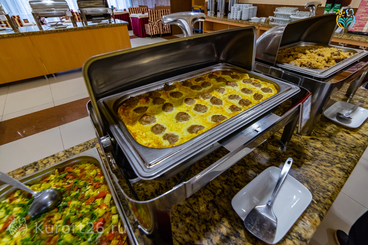 Меню ресторана включает блюда русской, кавказской и узбекской кухни. Три раза в неделю проводятся дни национальной кухни с живой музыкой.