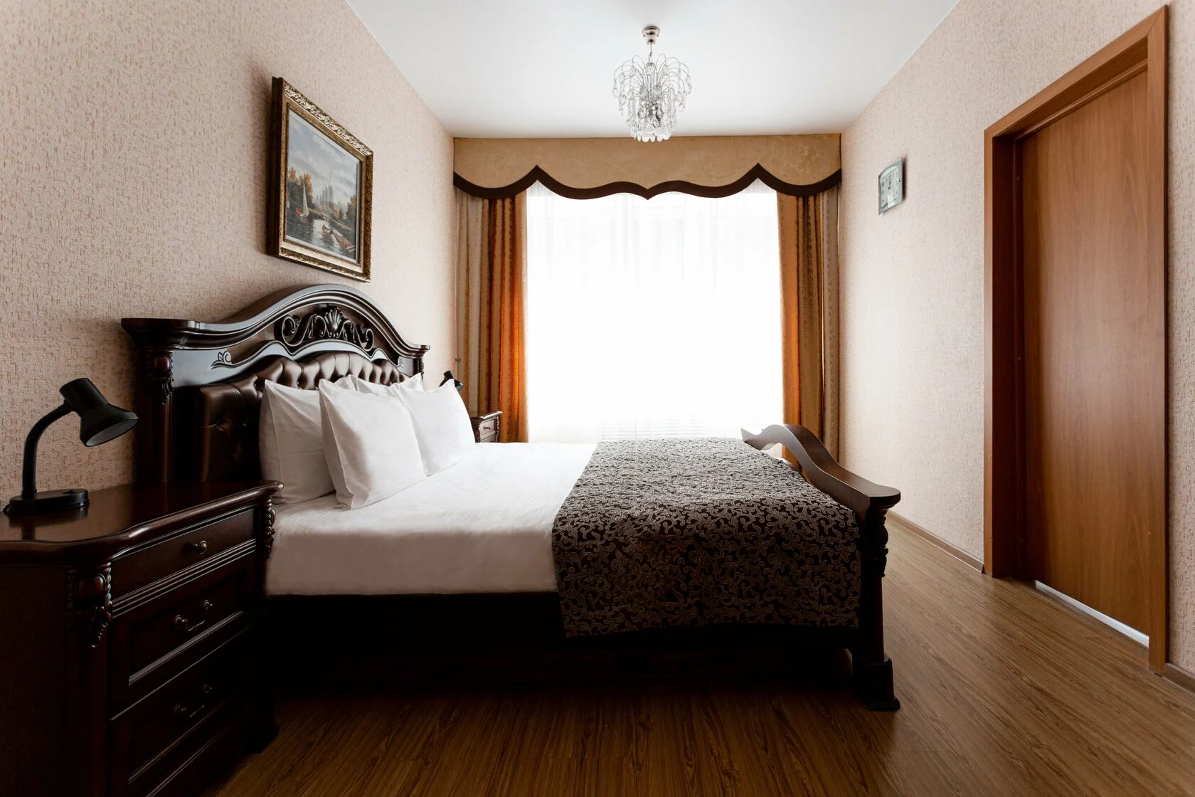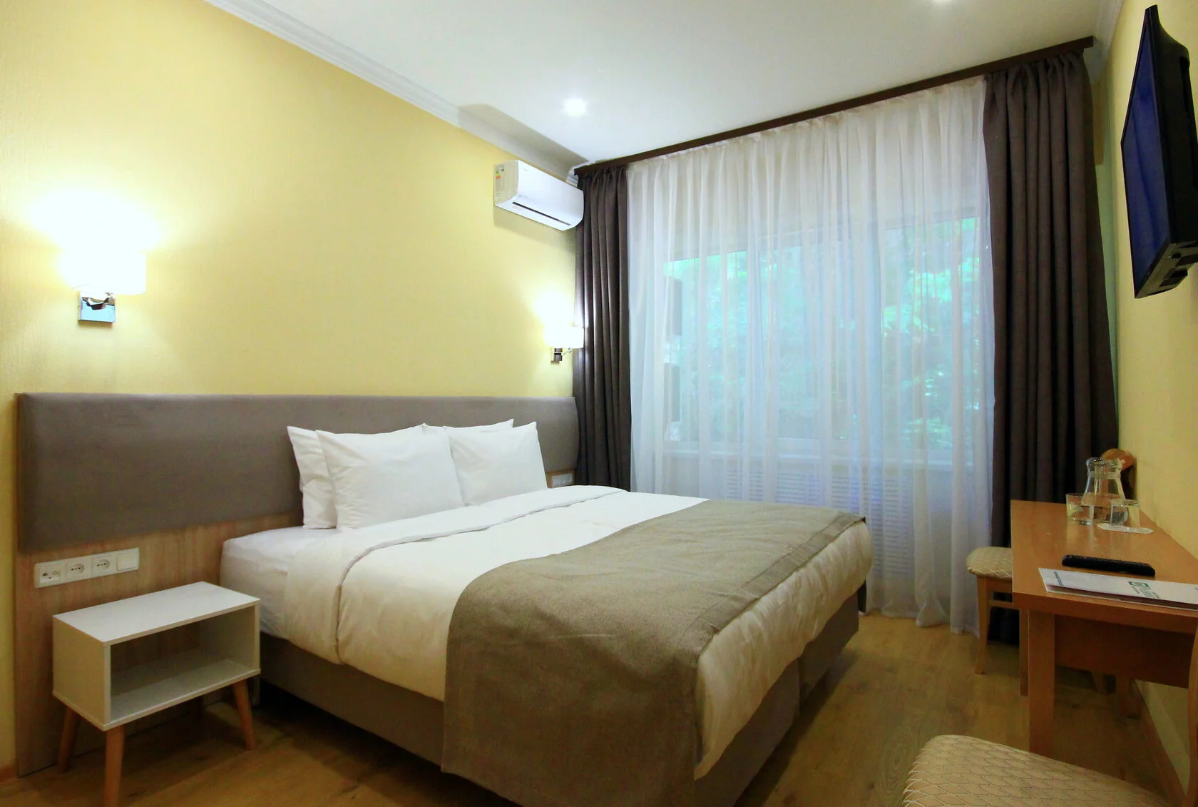 холодильник, телевизор, фен, сейф, ванные принадлежности, двуспальная кровать, шкаф, обеденный стол, две тумбочки, два стула, набор косметических средств, Wi-Fi