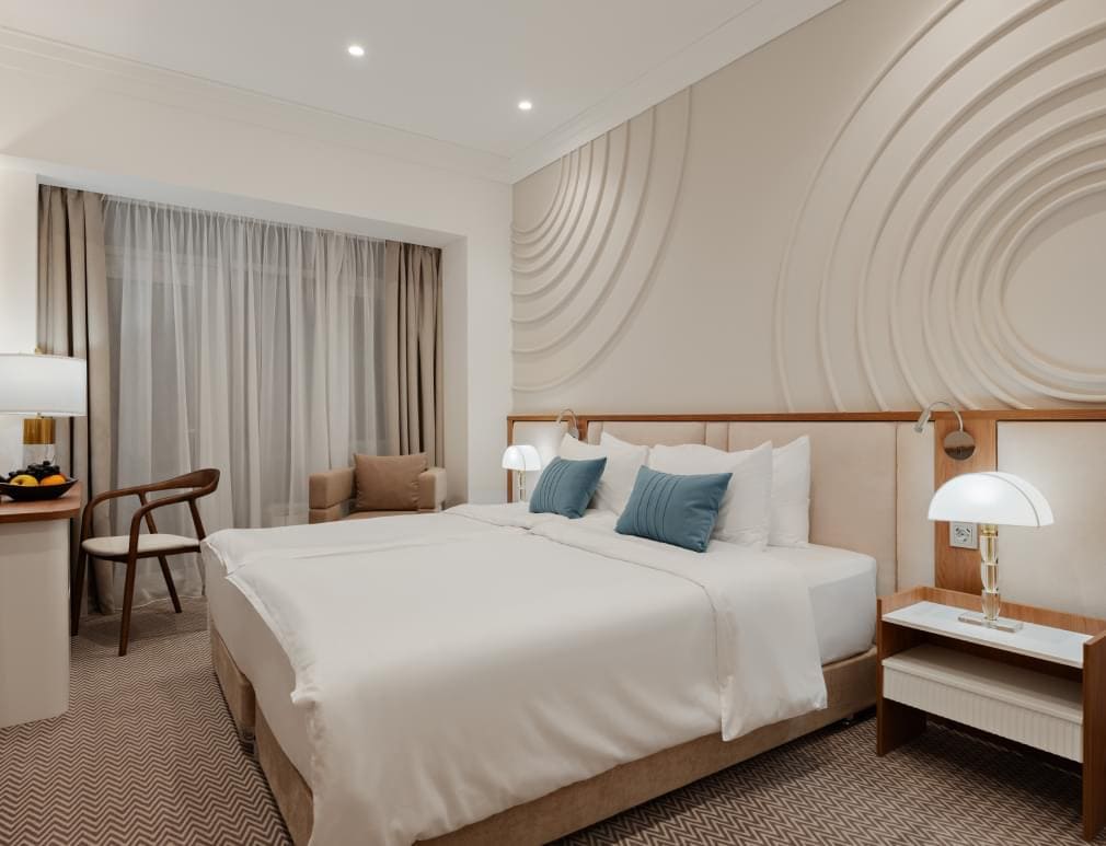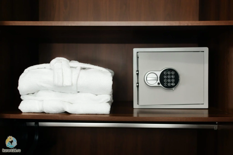 кондиционер, телевизор, фен, балкон, сейф, телефон, ванные принадлежности, тапочки, обеденный стол, кофемашина, халаты, набор косметических средств, набор полотенец, Рабочая зона с письменным столом и удобным стулом, гардеробная комната, кровать «King size», Wi-Fi