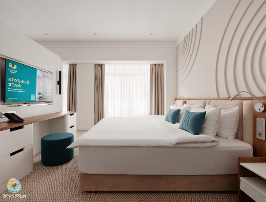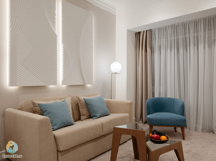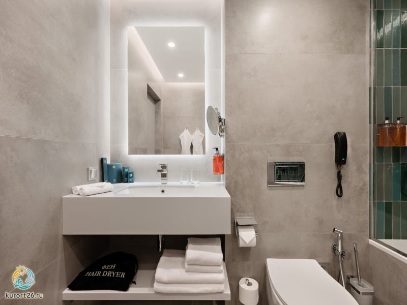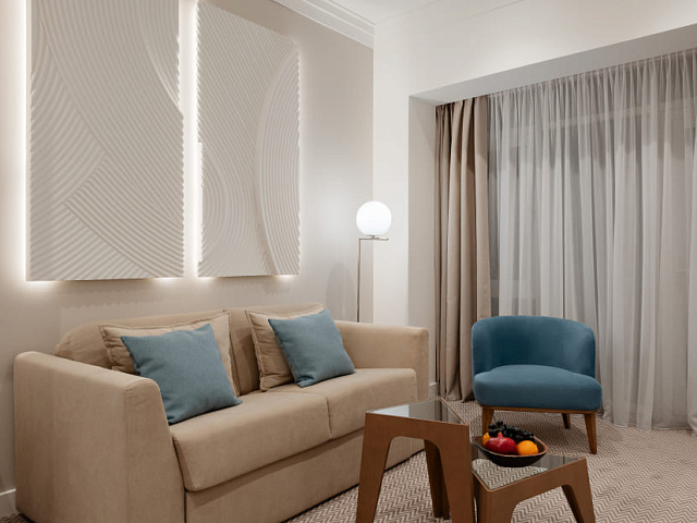кондиционер, телевизор, фен, балкон, сейф, телефон, ванные принадлежности, тапочки, обеденный стол, кофемашина, халаты, набор косметических средств, набор полотенец, Рабочая зона с письменным столом и удобным стулом, гардеробная комната, кровать «King size», Wi-Fi