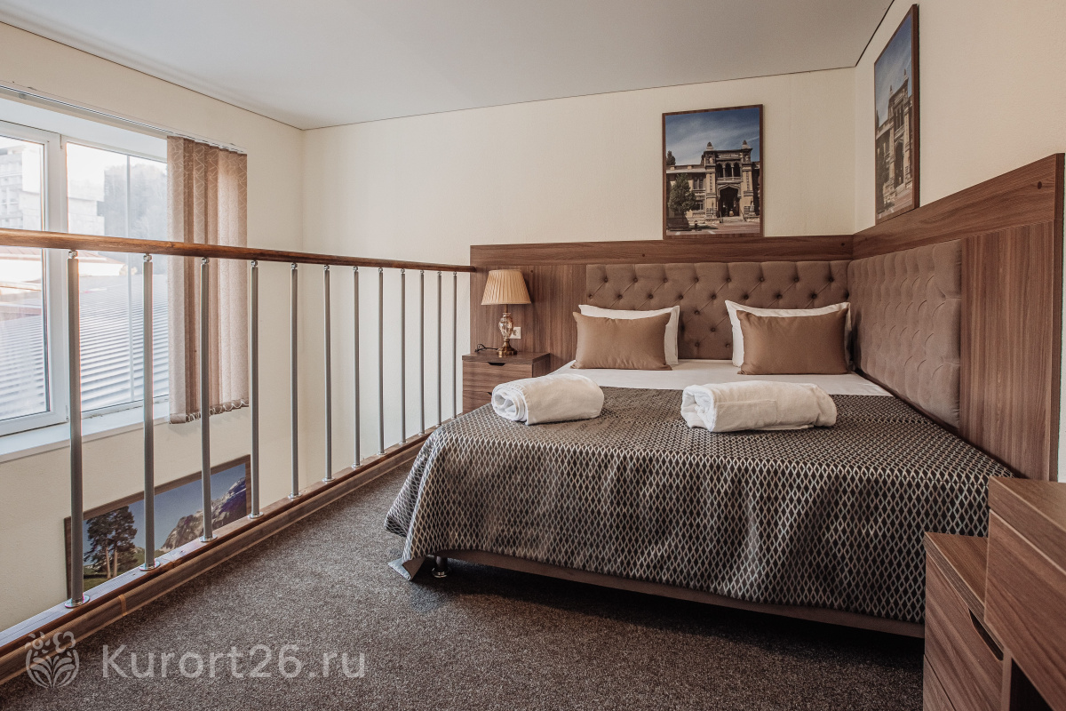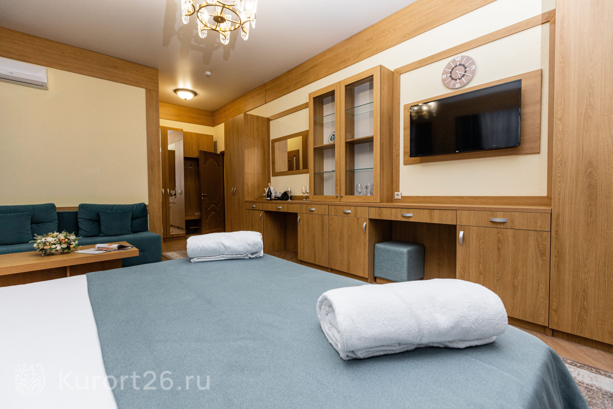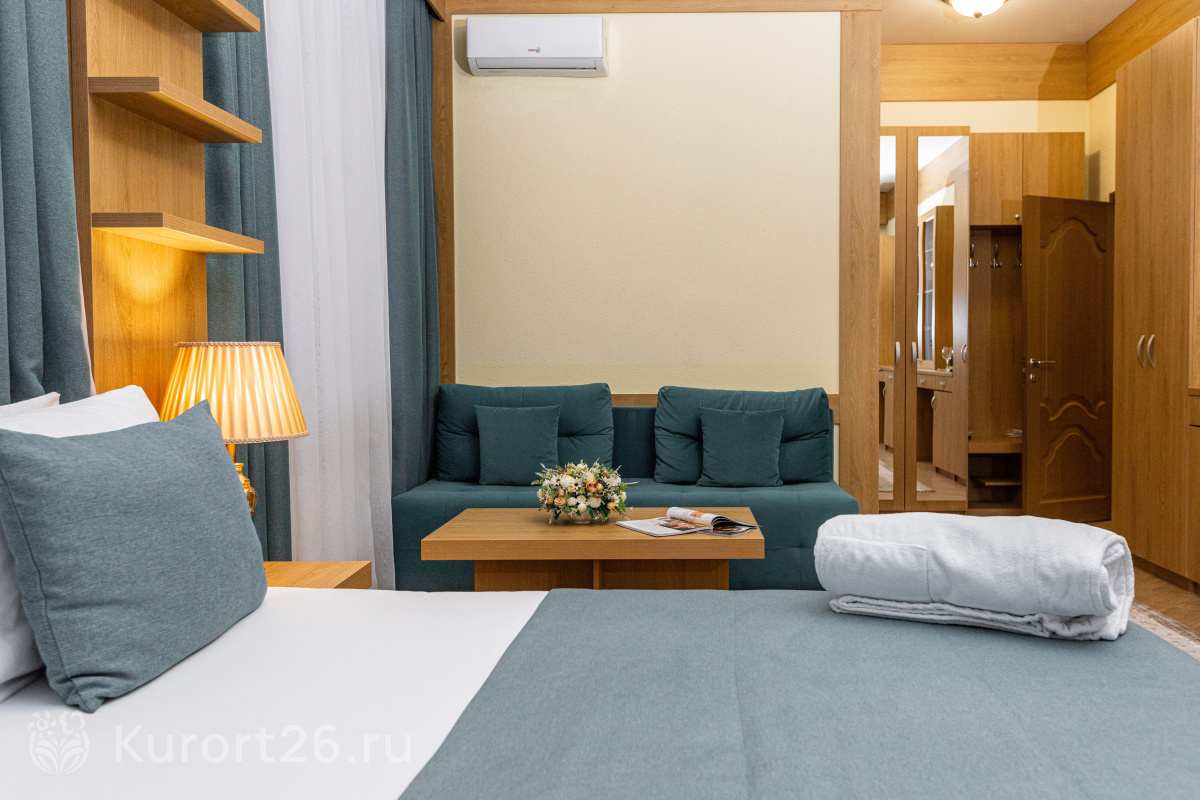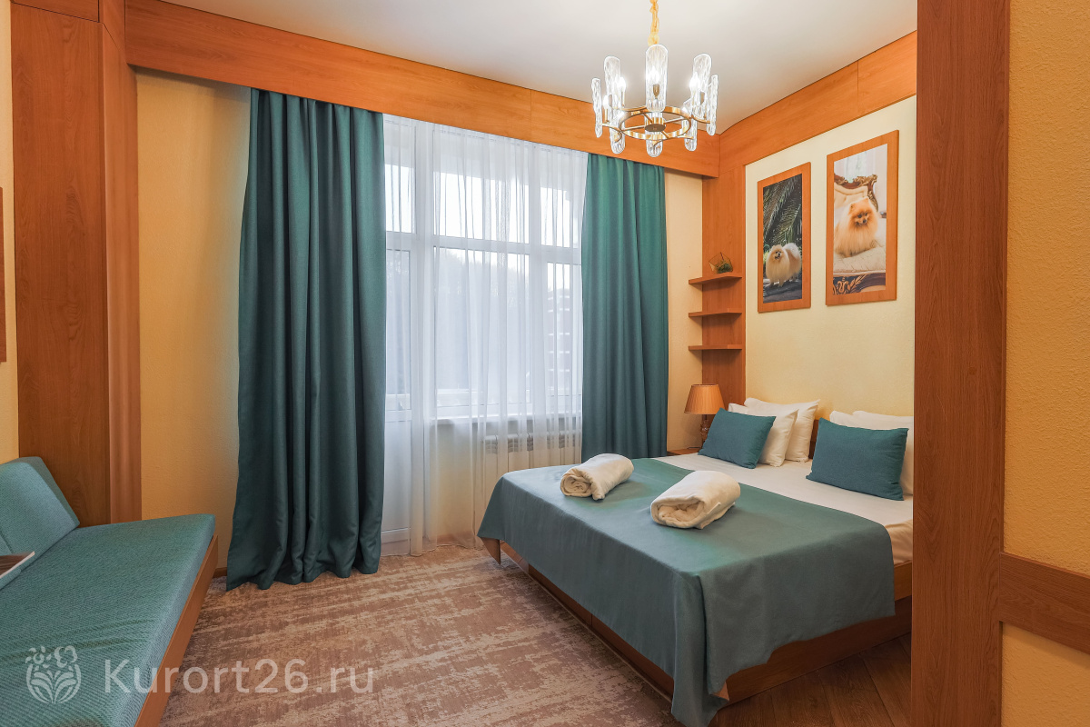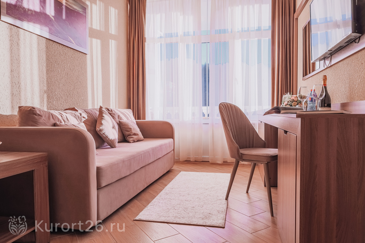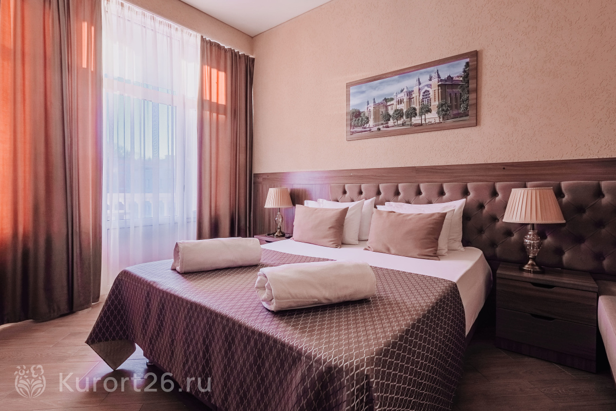 Здание санатория — архитектурный и исторический памятник города. Снаружи и внутри санаторий напоминает дворец: роскошные интерьеры, высокие потолки, каскадные люстры. Номера отдельного типа с кроватями king size, сплит-системой, чайной станцией, мини-баром. Услуга «Меню сна» позволяет выбрать подушки и матрас идеальной жесткости для комфортного и здорового сна. Есть номера с балконами с видом на бульвар.