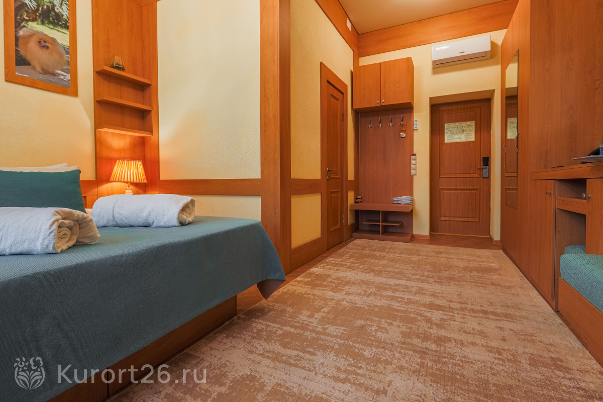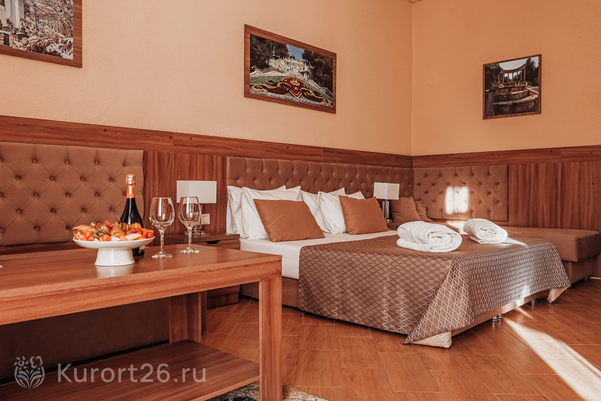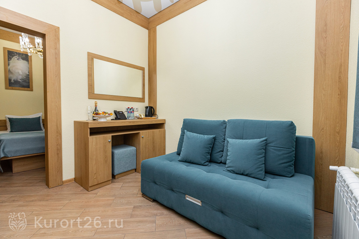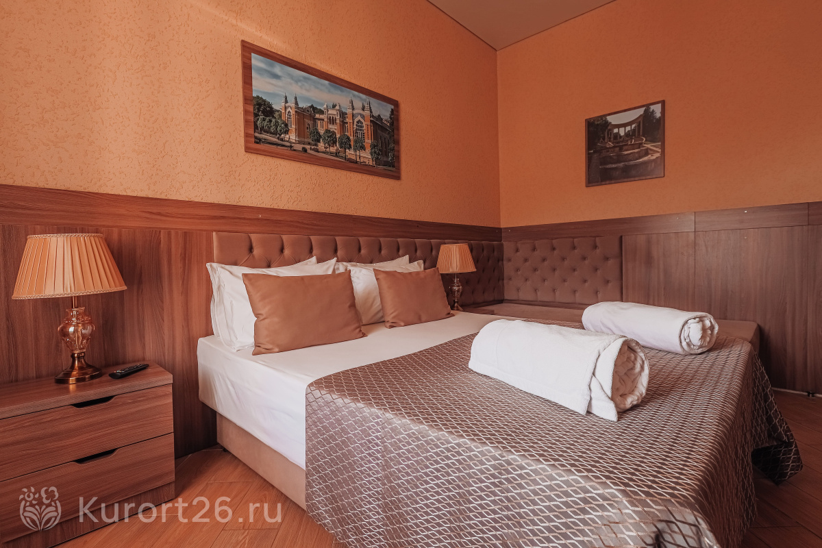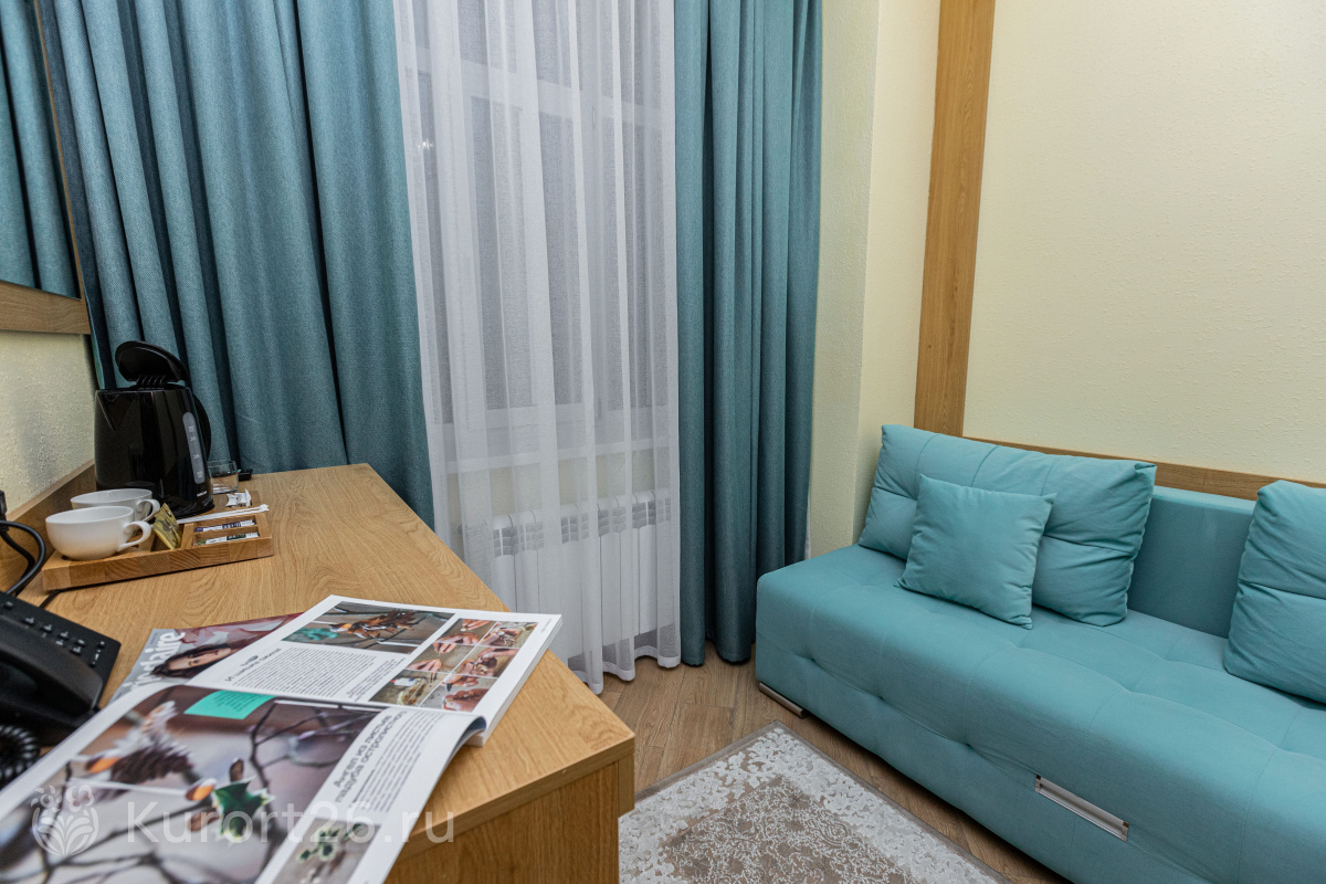 Здание санатория — архитектурный и исторический памятник города. Снаружи и внутри санаторий напоминает дворец: роскошные интерьеры, высокие потолки, каскадные люстры. Номера отдельного типа с кроватями king size, сплит-системой, чайной станцией, мини-баром. Услуга «Меню сна» позволяет выбрать подушки и матрас идеальной жесткости для комфортного и здорового сна. Есть номера с балконами с видом на бульвар.