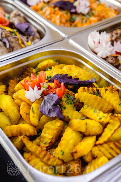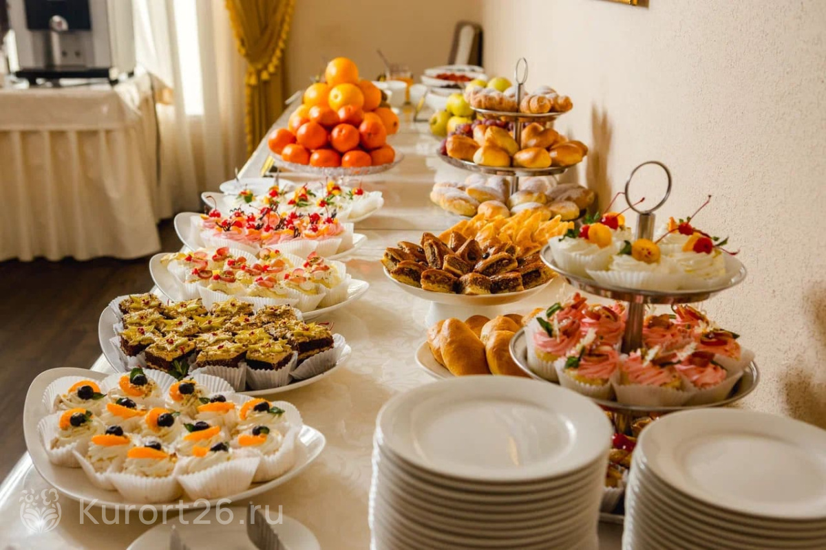 В цену путёвки включено трёхразовое питание «шведский стол» + алкогольные и безалкогольные напитки. По запросу доступно специальное питание: детокс, халяль, интервальное. Гости отмечают, что блюда разнообразные и вкусные.
