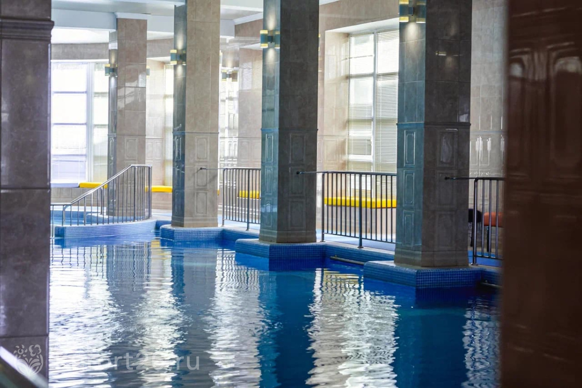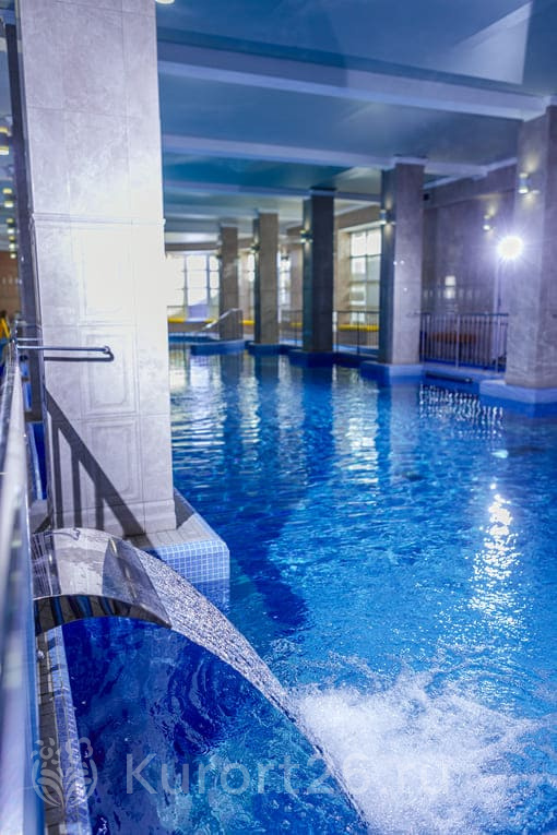 Акватермальный комплекс санатория объединяет: бассейн 30×8×1,2 метров с противотоком, гидромассажем и водопадами, турецкий хаммам, три вида саун (финская, солевая и аромасауна) и климатическую террасу с зоной для загара с шезлонгами. Посещение включено во все виды путевок.