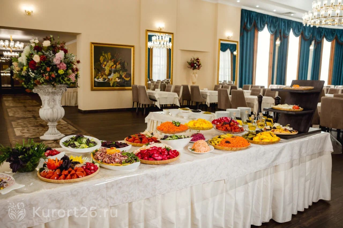 В санатории «Дворец Нарзанов» трёхразовое питание «шведский стол». В меню включены изысканные блюда, а также безалкогольные и алкогольные напитки. На завтрак подают красную икру и семгу, вечером — красное и белое вино.