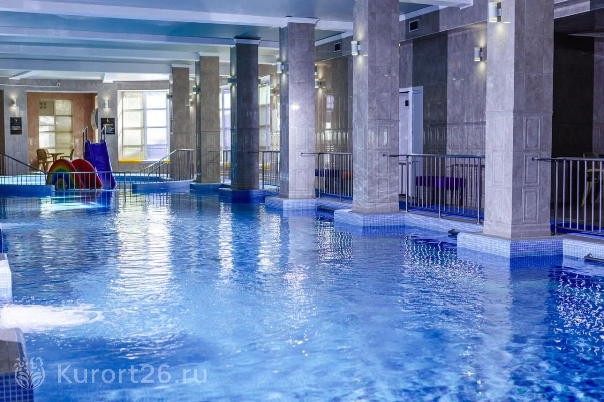 - Крытый бассейн 30×8×1,2 м с противотоком, гидромассажем и водопадами. Работает с 9:00 до 21:00, посещение безлимитно. Бассейн «Дворца нарзанов» — один из самых больших в Кисловодске. Интерьерная особенность бассейна — колонны и панорамные окна.
