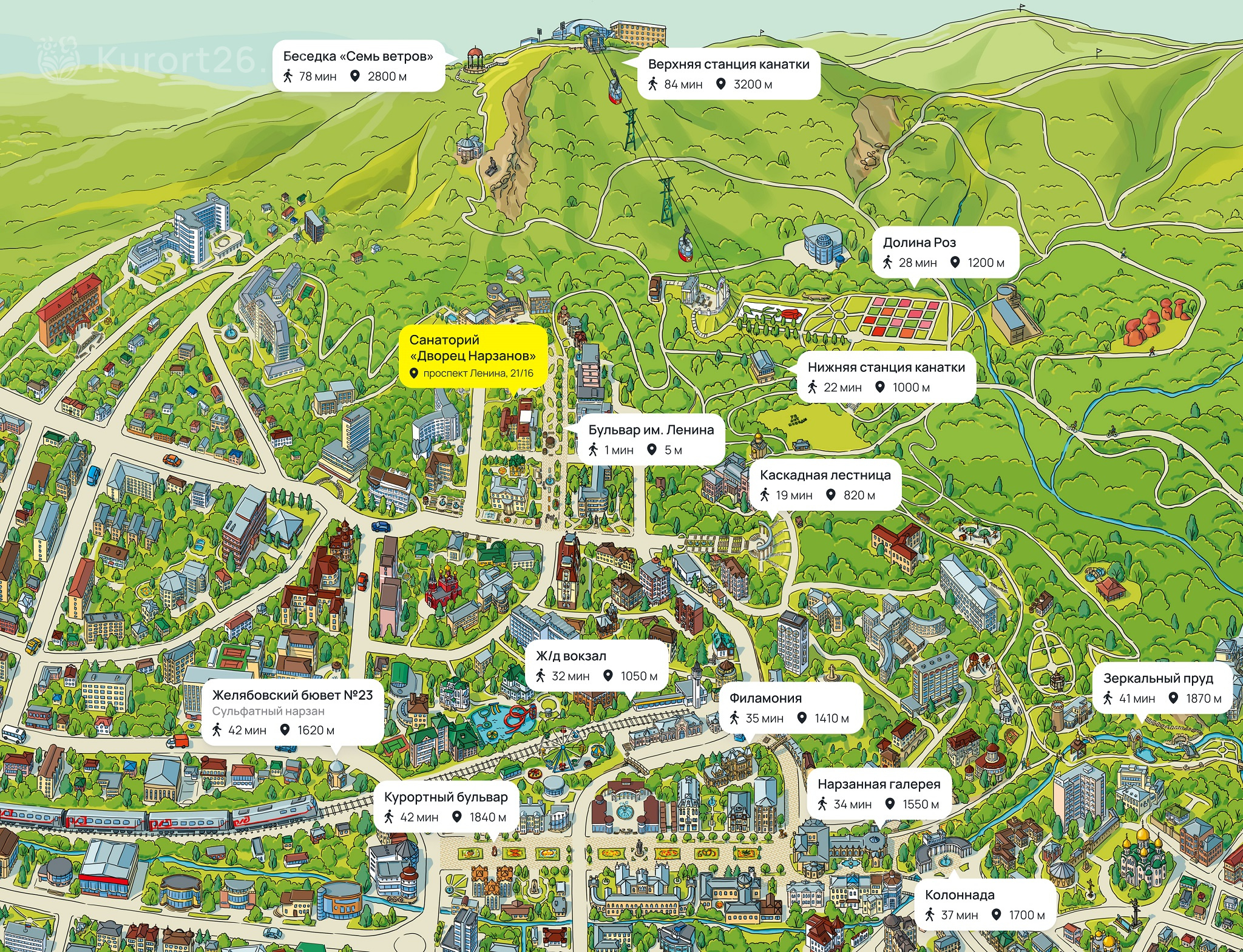 Санаторий «Дворец Нарзанов» 5* расположен в исторической части Кисловодска, у входа Верхний курортный парк. Санаторий находится на бульваре Ленина — это новая достопримечательность города с цветниками, фонтанами, скульптурными композициями. Рядом расположены Каскадная лестница, нижняя станция канатки, Долина роз.
