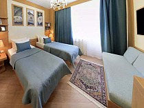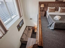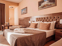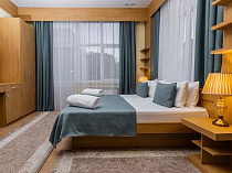 холодильник, телевизор, чайник, фен, сейф, тапочки, двуспальная кровать, шкаф, прикроватные тумбочки, мягкая мебель, зеркало, журнальный столик, стул, посуда, халаты, набор косметических средств, набор полотенец, Wi-Fi