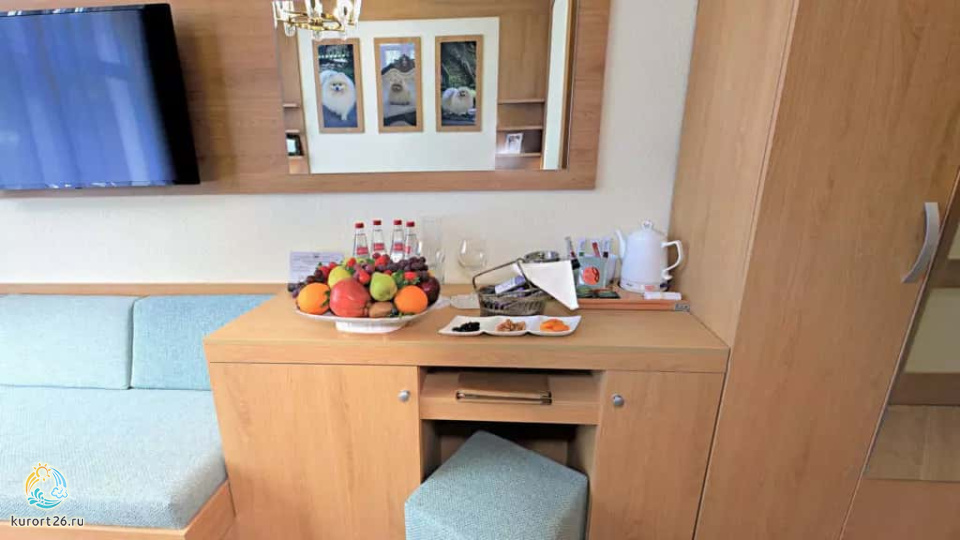 холодильник, телевизор, чайник, фен, душ, телефон, тапочки, двуспальная кровать, шкаф, прикроватные тумбочки, мягкая мебель, диван, зеркало, сплит-система, ванная комната, система климат-контроля, журнальный столик, стул, посуда, халаты, набор косметических средств, набор полотенец, Банные принадлежности, Гостиничная парфюмерия, чайный набор, гигиенические принадлежности, Wi-Fi