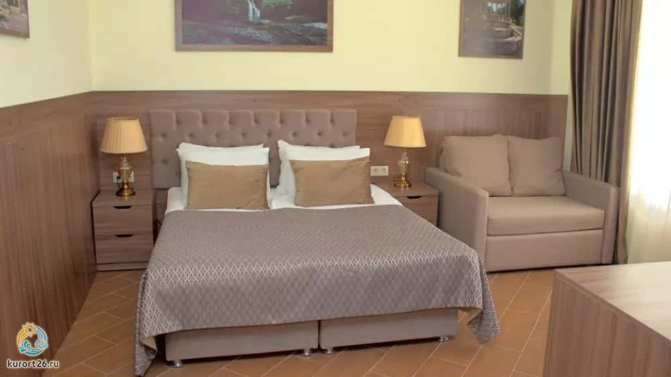 холодильник, телевизор, чайник, фен, тапочки, шкаф, прикроватные тумбочки, мягкая мебель, зеркало, система климат-контроля, двуспальная кровать / две односпальные кровати, журнальный столик, стул, посуда, халаты, набор косметических средств, набор полотенец, Wi-Fi