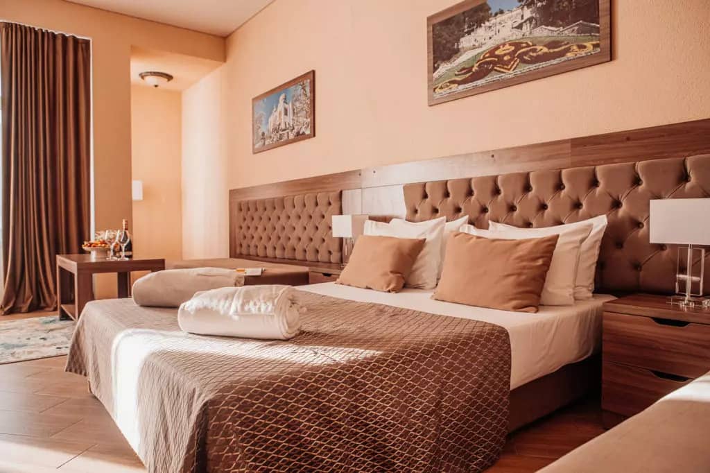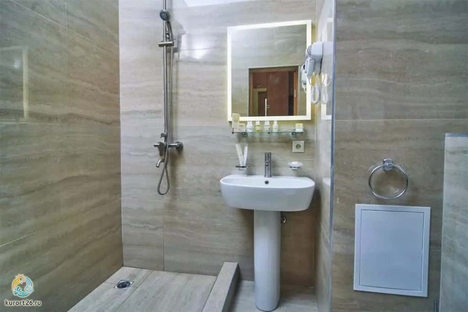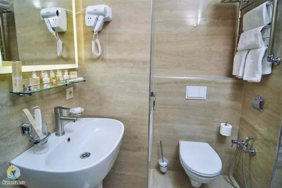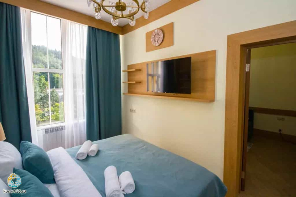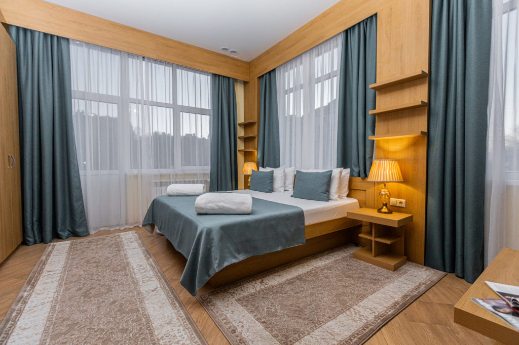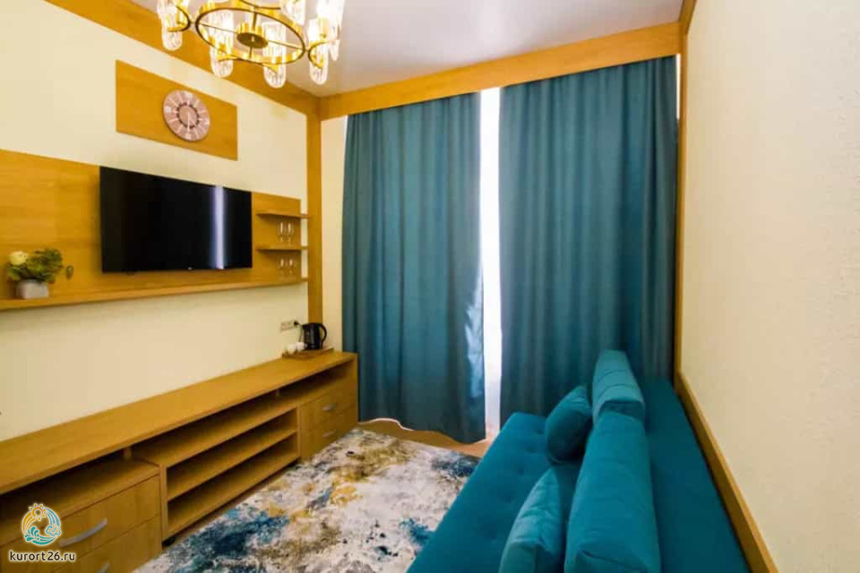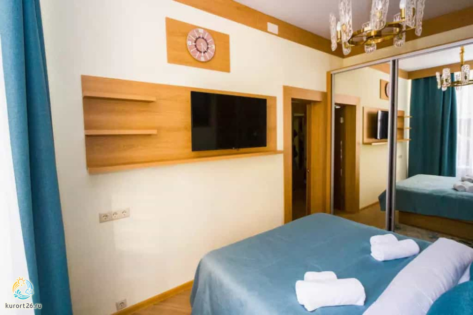 холодильник, телевизор, чайник, фен, тапочки, шкаф, прикроватные тумбочки, мягкая мебель, зеркало, система климат-контроля, двуспальная кровать / две односпальные кровати, журнальный столик, стул, посуда, халаты, набор косметических средств, набор полотенец, Wi-Fi