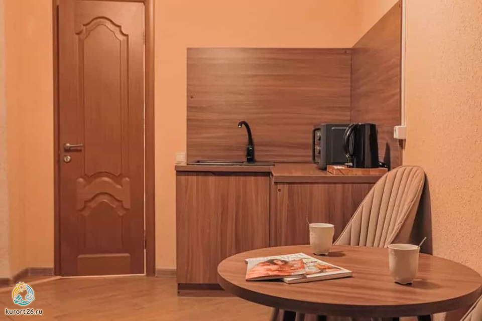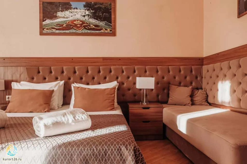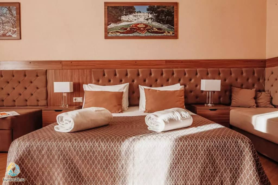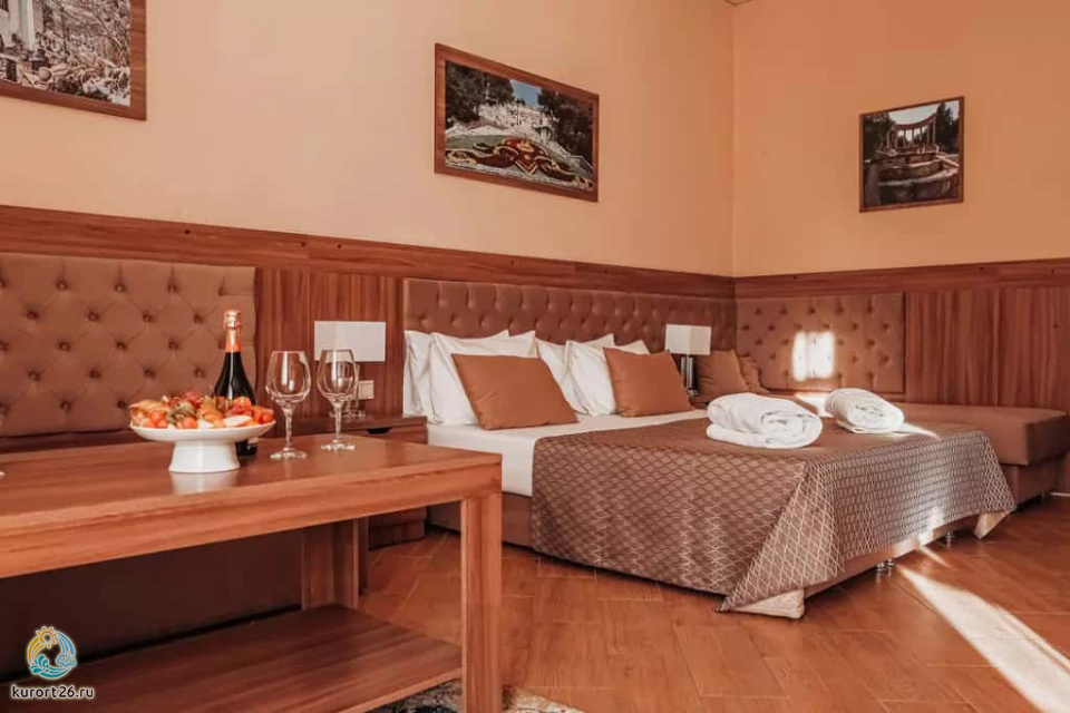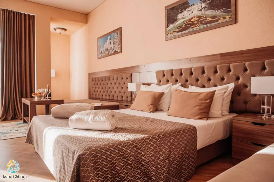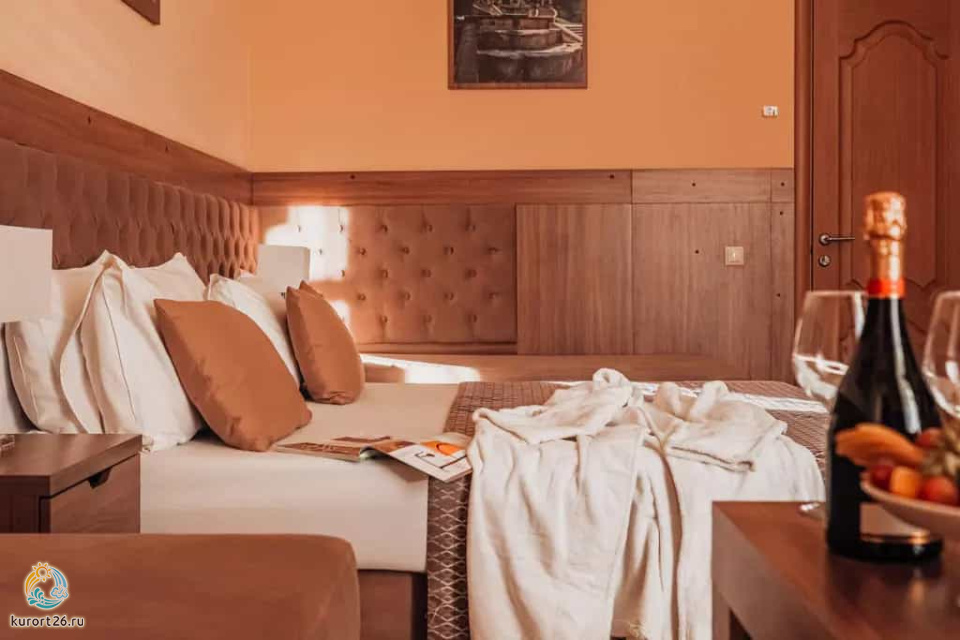 холодильник, телевизор, чайник, фен, тапочки, шкаф, прикроватные тумбочки, мягкая мебель, зеркало, система климат-контроля, двуспальная кровать / две односпальные кровати, журнальный столик, стул, посуда, халаты, набор косметических средств, набор полотенец, Wi-Fi