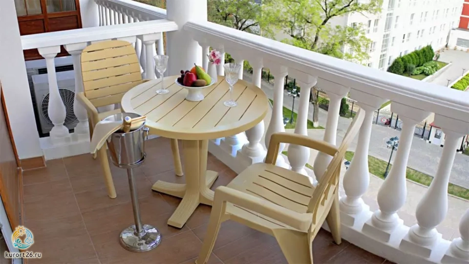 холодильник, чайник, фен, сейф, телефон, тапочки, шкаф, прикроватные тумбочки, мягкая мебель, зеркало, два телевизора, система климат-контроля, журнальный столик, стул, посуда, халаты, набор косметических средств, набор полотенец, лоджия, Wi-Fi