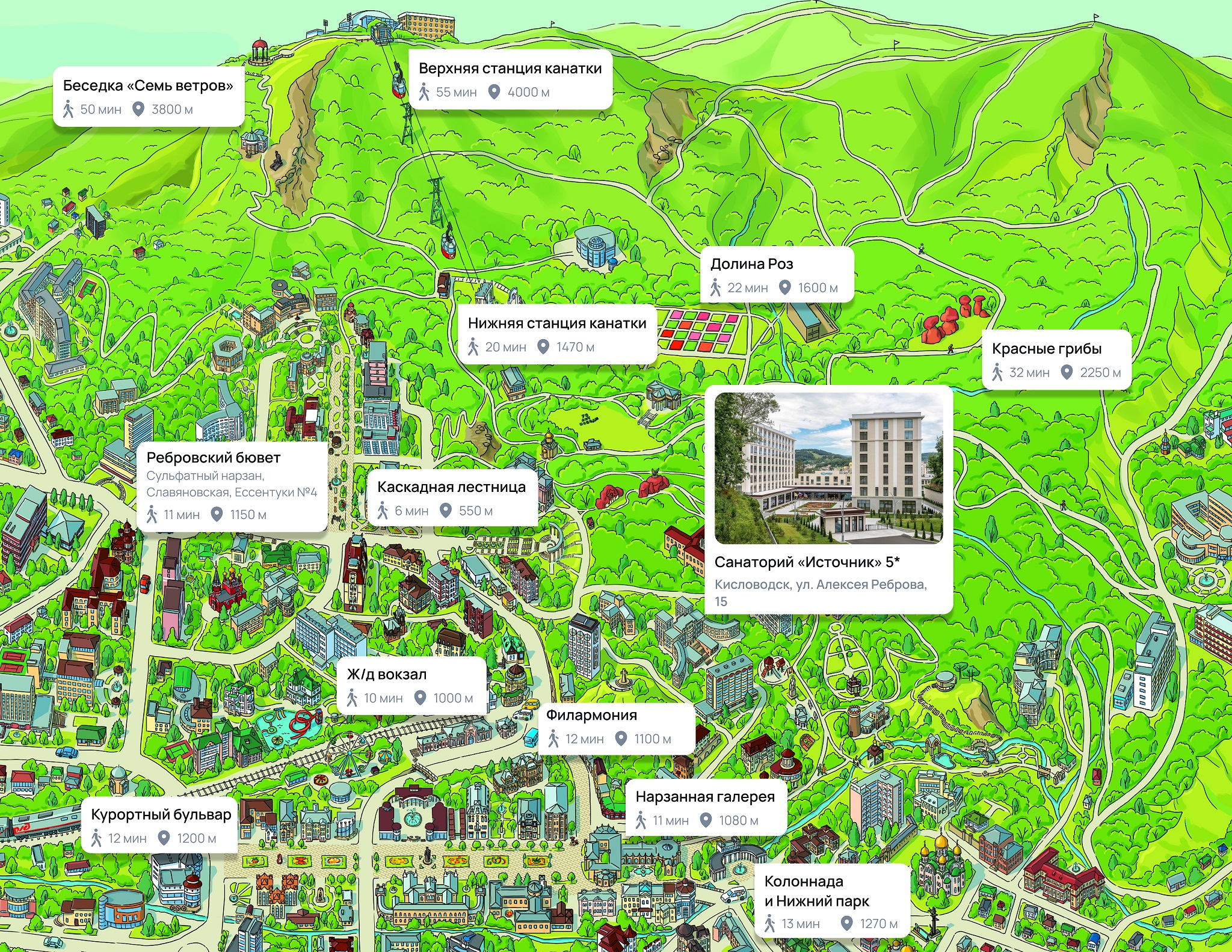 Премиальный санаторно-курортный комплекс расположен в самом сердце курортной зоны Кисловодска, в ущелье двух живописных балок. У санатория есть свой выход в Курортный парк, за 10 минут прогулочным шагом можно добраться до главных достопримечательностей Кисловодска: Нарзанной галереи, Филармонии, Курортного бульвара, Каскадной лестницы, железнодорожного вокзала.