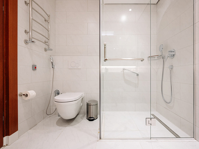 Ванная комната с душевой кабиной душевая кабина, есть гигиенический душ, фен, косметическое зеркало, банные принадлежности, халат, тапочки, гостиничная парфюмерия.