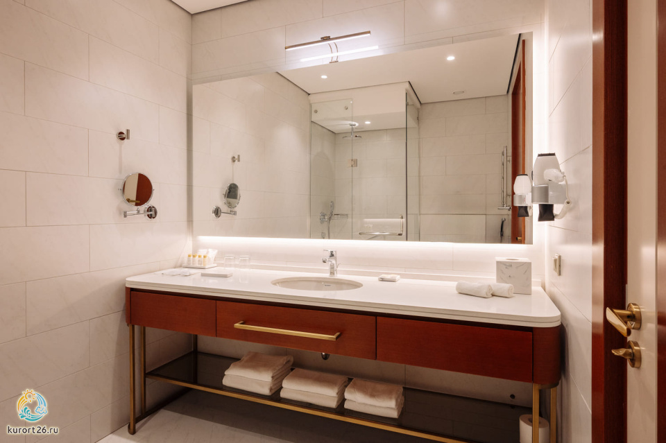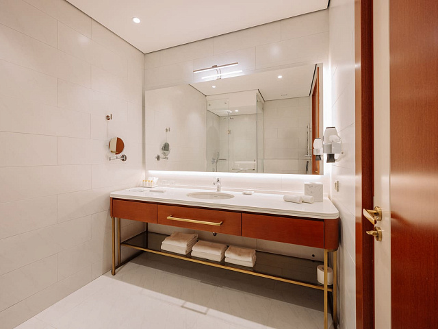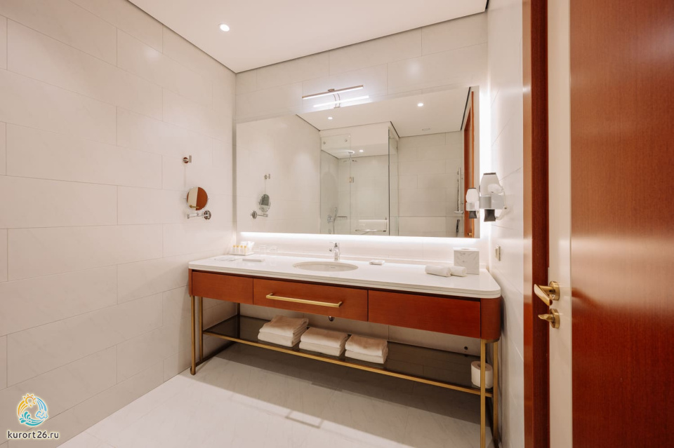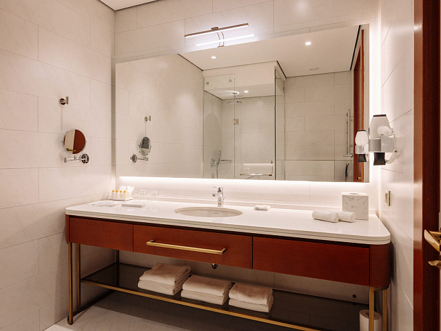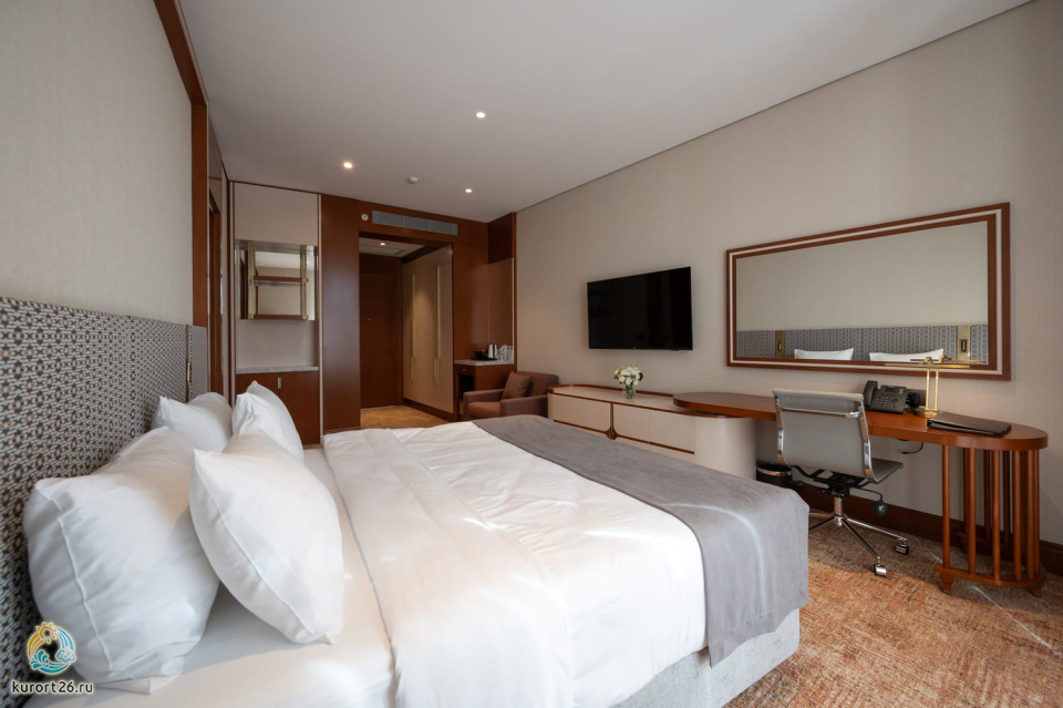 телевизор, фен, набор чайной посуды, балкон, сейф, телефон, мини-бар, халат, тапочки, электрочайник, зеркало, Рабочая зона с письменным столом и удобным стулом, Система климат-контроль, Туалетный столик, Душевая кабина, Гигиенический душ, Банные принадлежности, Гостиничная парфюмерия, 1 двуспальная кровать в DBL или 2 односпальные с ортопедическим матрасом в TWIN, гардеробная комната, раскладной диван в DBL или раскладное кресло в TWIN