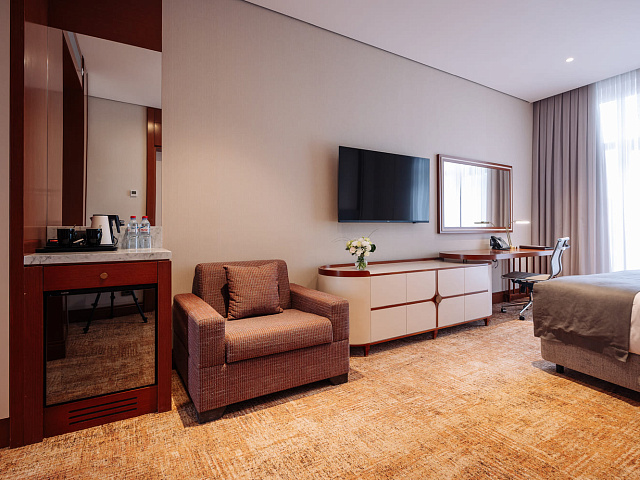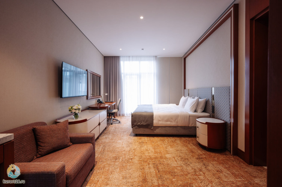 телевизор, фен, набор чайной посуды, балкон, сейф, телефон, мини-бар, халат, тапочки, диван, электрочайник, зеркало, система климат-контроля, журнальный столик, двуспальная кровать с ортопедическим матрасом, Рабочая зона с письменным столом и удобным стулом, Туалетный столик, Душевая кабина, Гигиенический душ, Банные принадлежности, Гостиничная парфюмерия