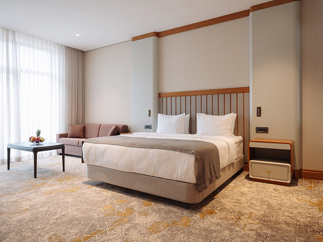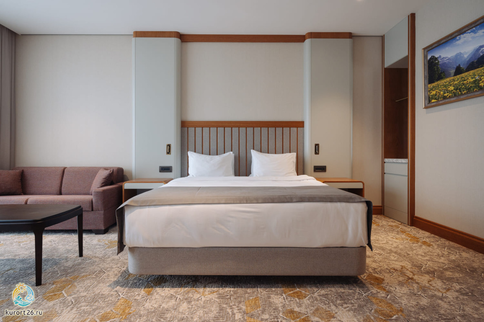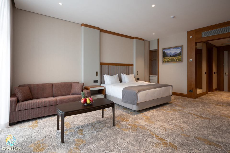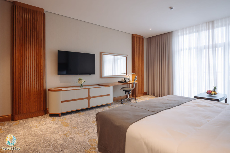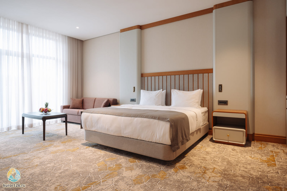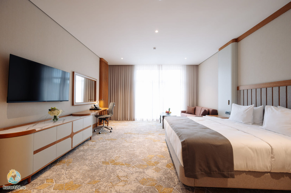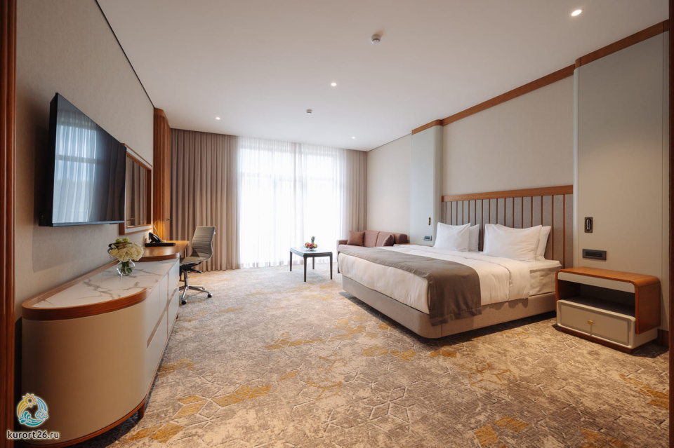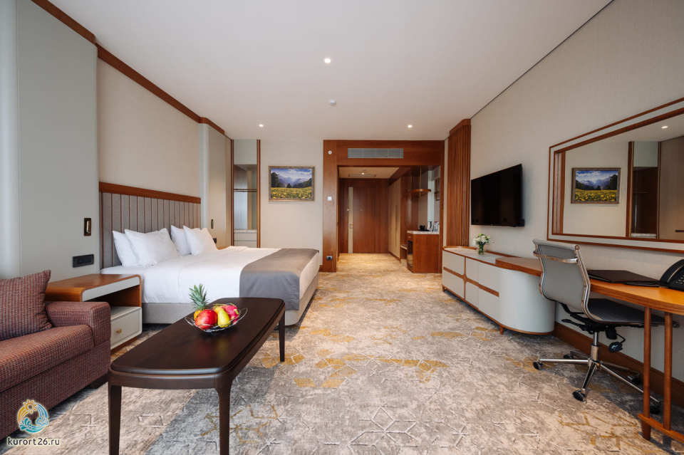 телевизор, фен, набор чайной посуды, балкон, сейф, телефон, мини-бар, халат, тапочки, диван, электрочайник, зеркало, система климат-контроля, журнальный столик, двуспальная кровать с ортопедическим матрасом, Рабочая зона с письменным столом и удобным стулом, Туалетный столик, Душевая кабина, Гигиенический душ, Банные принадлежности, Гостиничная парфюмерия