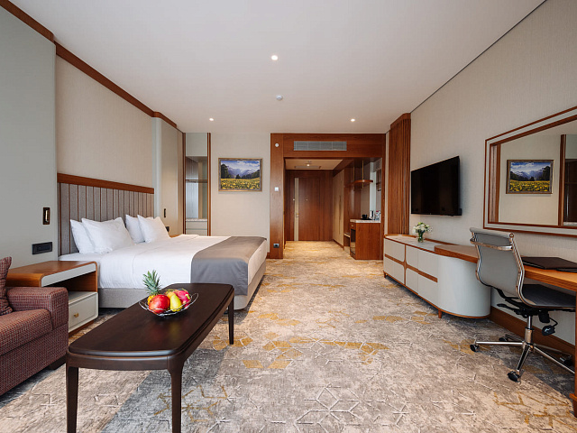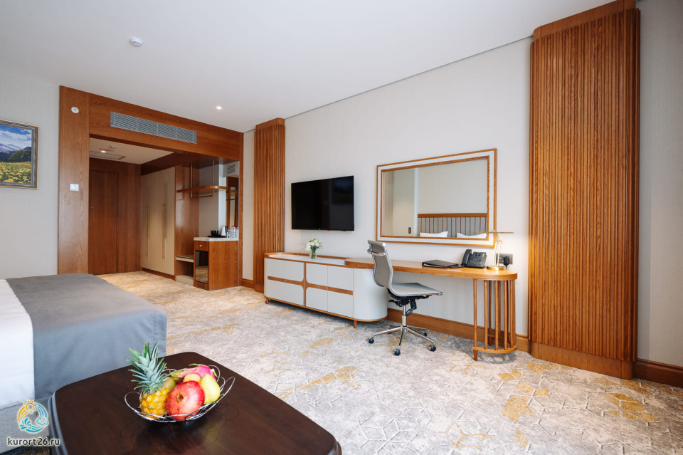 телевизор, фен, набор чайной посуды, балкон, сейф, телефон, мини-бар, халат, тапочки, диван, электрочайник, зеркало, кресло, система климат-контроля, журнальный столик, двуспальная кровать с ортопедическим матрасом, Рабочая зона с письменным столом и удобным стулом, Туалетный столик, Душевая кабина, Гигиенический душ, Банные принадлежности, Гостиничная парфюмерия