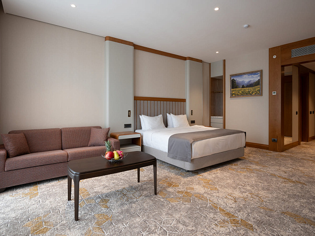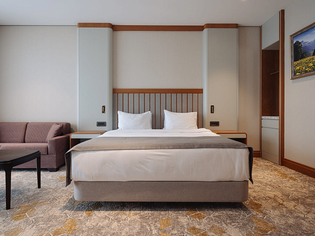 телевизор, фен, набор чайной посуды, балкон, сейф, телефон, мини-бар, халат, тапочки, диван, электрочайник, зеркало, два кресла, система климат-контроля, журнальный столик, двуспальная кровать с ортопедическим матрасом, Рабочая зона с письменным столом и удобным стулом, Туалетный столик, Душевая кабина, Гигиенический душ, Банные принадлежности, Гостиничная парфюмерия, 2 односпальные кровати с ортопедическим матрасом