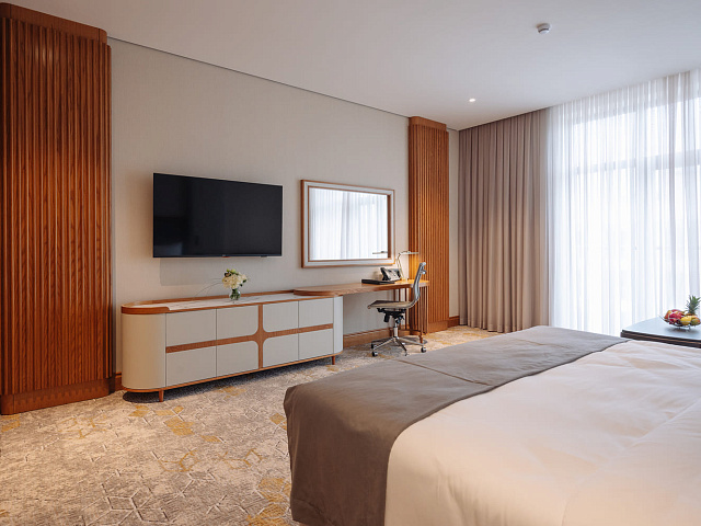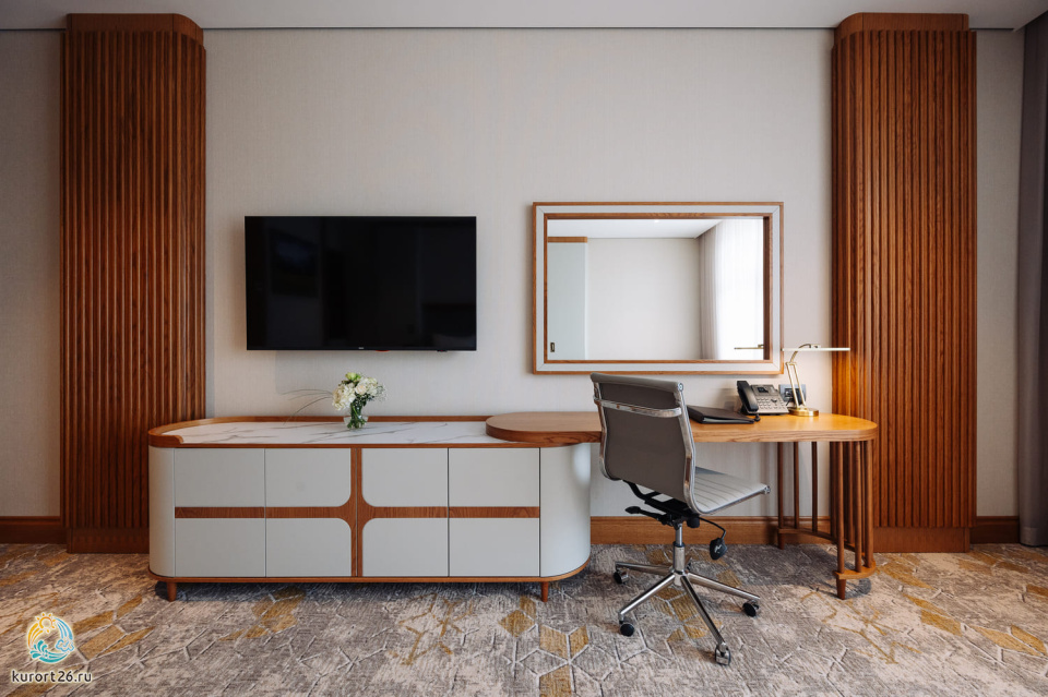 телевизор, фен, набор чайной посуды, балкон, сейф, телефон, мини-бар, халат, тапочки, электрочайник, зеркало, Рабочая зона с письменным столом и удобным стулом, Система климат-контроль, Туалетный столик, Душевая кабина, Гигиенический душ, Банные принадлежности, Гостиничная парфюмерия, 1 двуспальная кровать в DBL или 2 односпальные с ортопедическим матрасом в TWIN, гардеробная комната, раскладной диван в DBL или раскладное кресло в TWIN