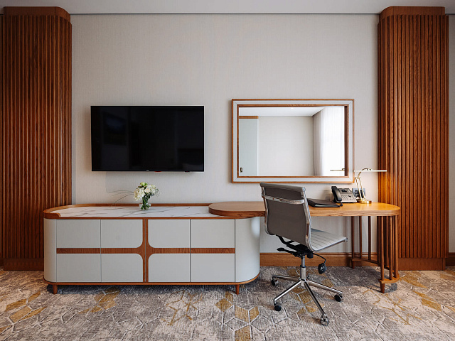телевизор, фен, набор чайной посуды, балкон, сейф, телефон, мини-бар, халат, тапочки, электрочайник, зеркало, двуспальная кровать с ортопедическим матрасом, Рабочая зона с письменным столом и удобным стулом, Система климат-контроль, Туалетный столик, Душевая кабина, Гигиенический душ, Банные принадлежности, Гостиничная парфюмерия