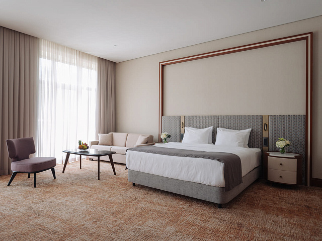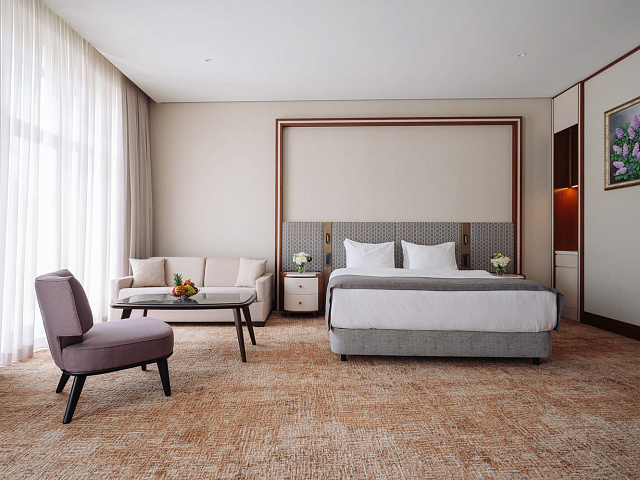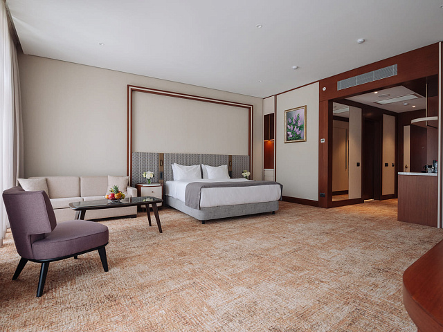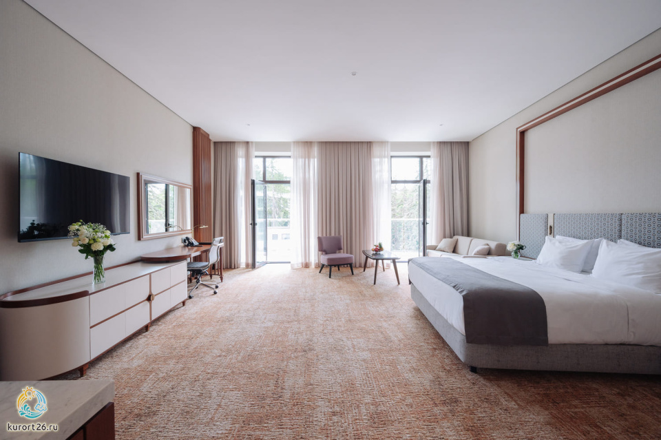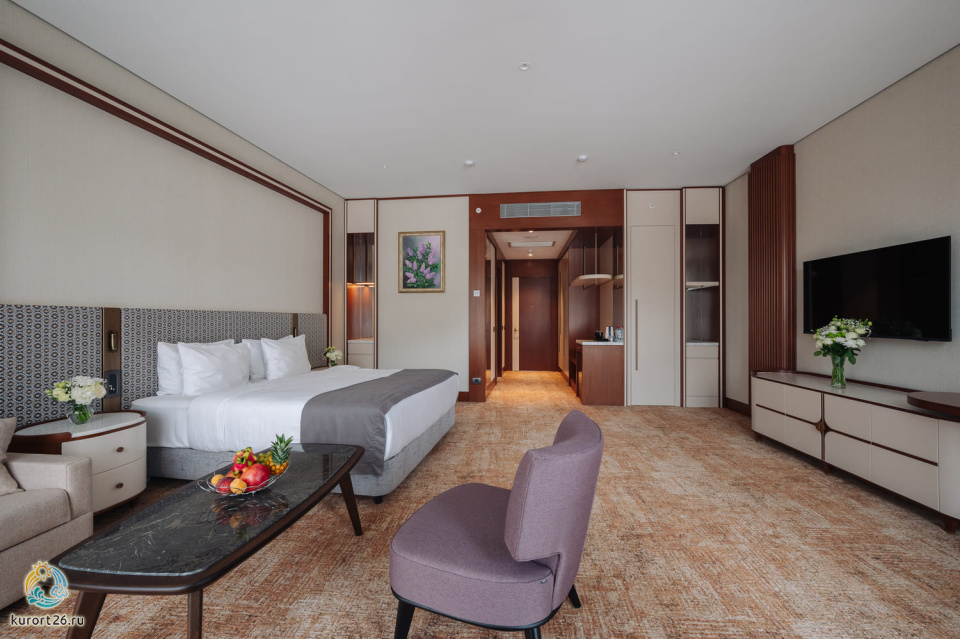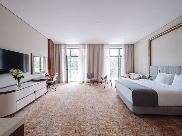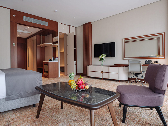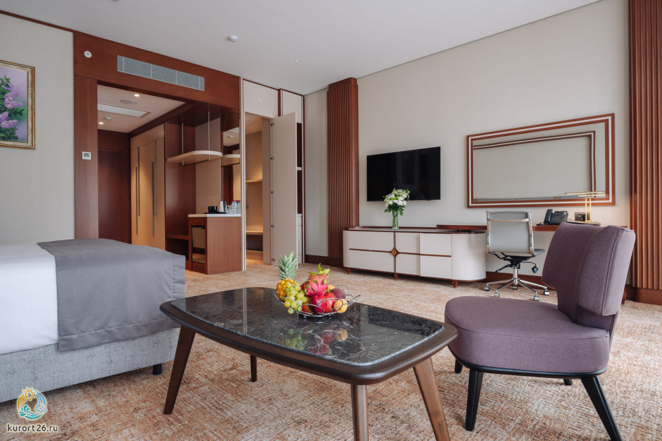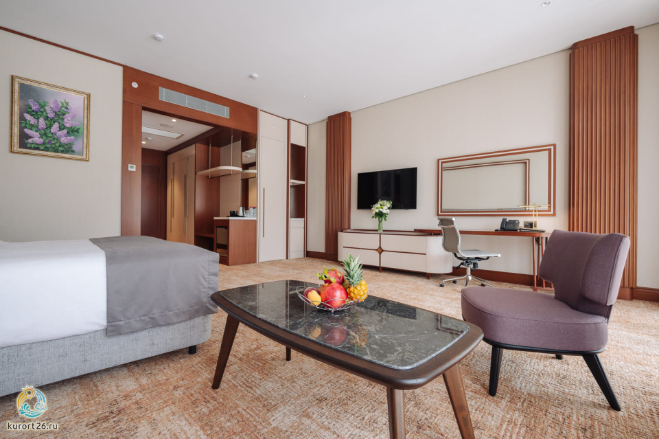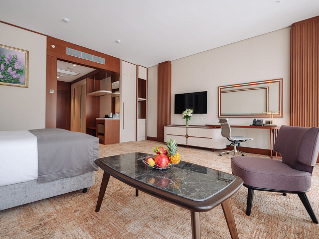 телевизор, фен, набор чайной посуды, балкон, сейф, телефон, мини-бар, халат, тапочки, диван, электрочайник, зеркало, система климат-контроля, журнальный столик, двуспальная кровать с ортопедическим матрасом, Рабочая зона с письменным столом и удобным стулом, Туалетный столик, Душевая кабина, Гигиенический душ, Банные принадлежности, Гостиничная парфюмерия