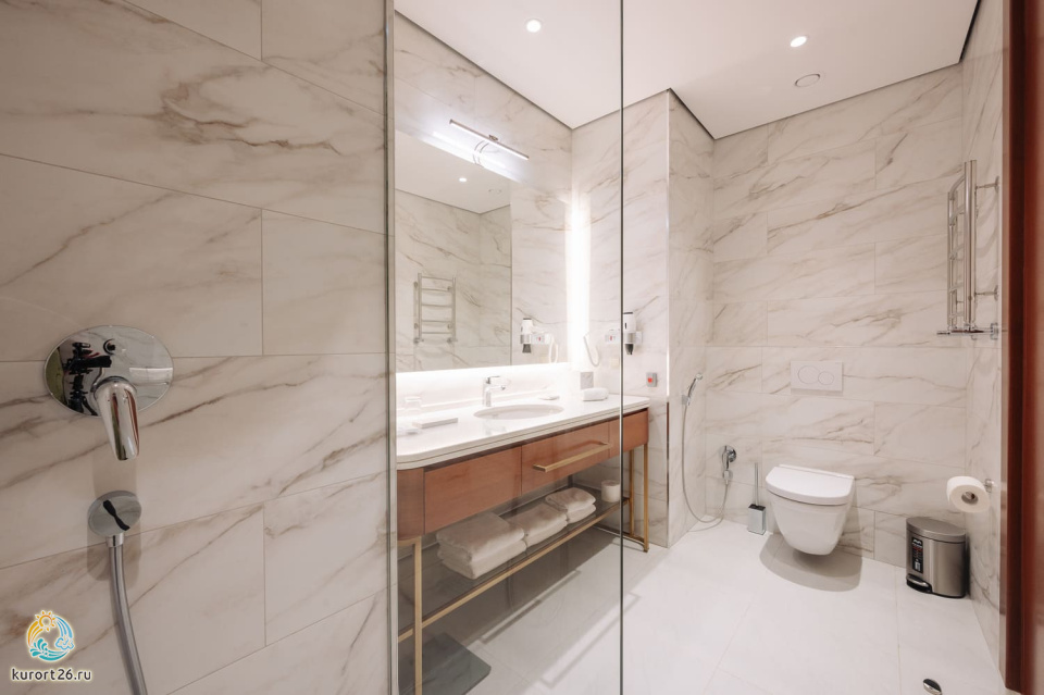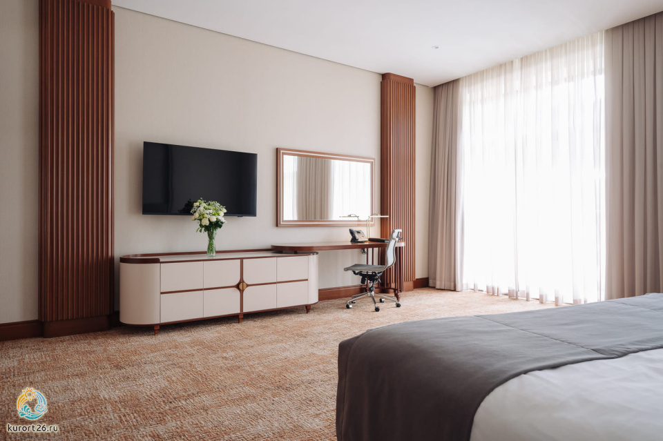 фен, набор чайной посуды, балкон, сейф, телефон, мини-бар, халат, тапочки, диван, электрочайник, зеркало, кресло, два телевизора, система климат-контроля, журнальный столик, двуспальная кровать с ортопедическим матрасом, Рабочая зона с письменным столом и удобным стулом, Туалетный столик, Душевая кабина, Гигиенический душ, Банные принадлежности, Гостиничная парфюмерия