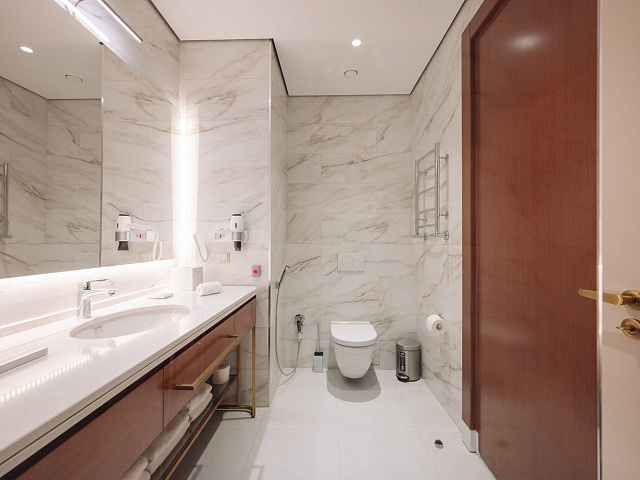 телевизор, фен, набор чайной посуды, балкон, сейф, телефон, мини-бар, халат, тапочки, электрочайник, зеркало, двуспальная кровать с ортопедическим матрасом, Рабочая зона с письменным столом и удобным стулом, Система климат-контроль, Туалетный столик, Душевая кабина, Гигиенический душ, Банные принадлежности, Гостиничная парфюмерия