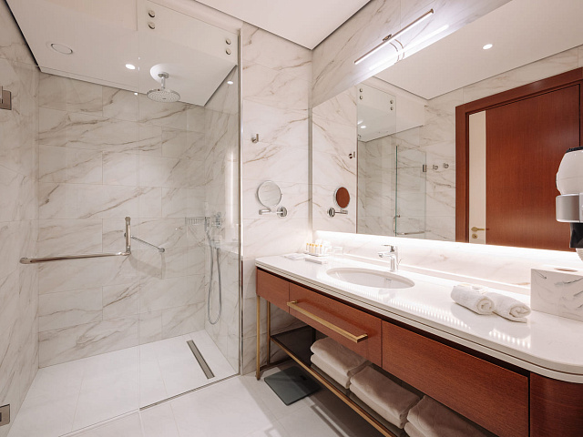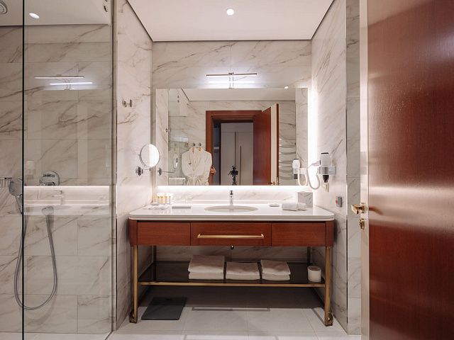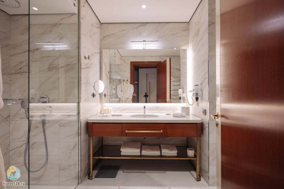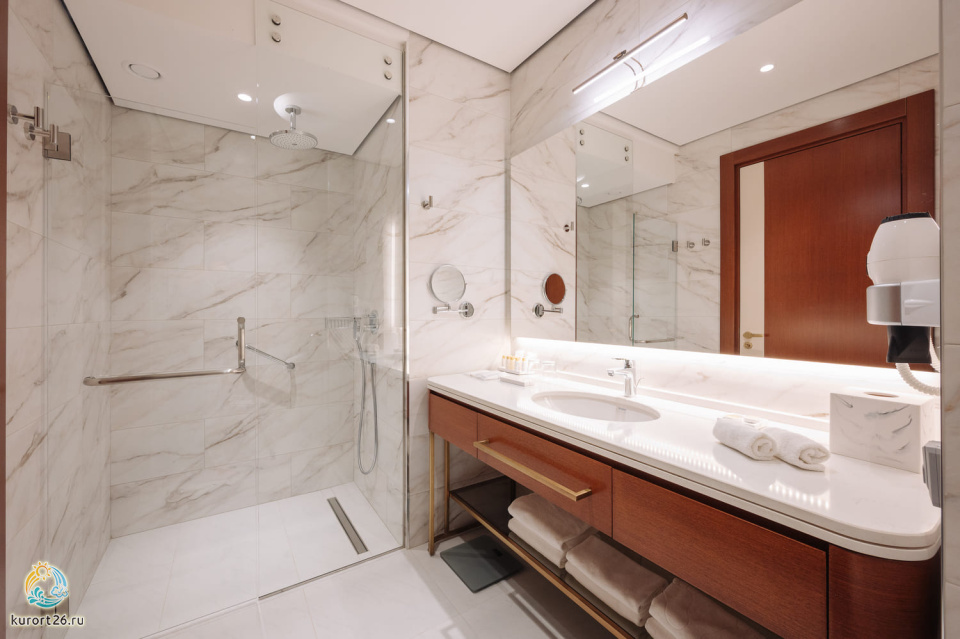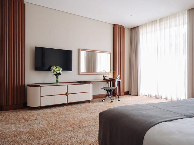 телевизор, фен, набор чайной посуды, балкон, сейф, телефон, мини-бар, халат, тапочки, электрочайник, зеркало, Рабочая зона с письменным столом и удобным стулом, Система климат-контроль, Туалетный столик, Душевая кабина, Гигиенический душ, Банные принадлежности, Гостиничная парфюмерия, 1 двуспальная кровать в DBL или 2 односпальные с ортопедическим матрасом в TWIN, гардеробная комната, раскладной диван в DBL или раскладное кресло в TWIN