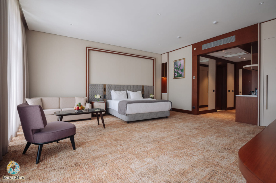 телевизор, фен, набор чайной посуды, балкон, сейф, телефон, мини-бар, халат, тапочки, диван, электрочайник, зеркало, кресло, система климат-контроля, журнальный столик, двуспальная кровать с ортопедическим матрасом, Рабочая зона с письменным столом и удобным стулом, Туалетный столик, Душевая кабина, Гигиенический душ, Банные принадлежности, Гостиничная парфюмерия
