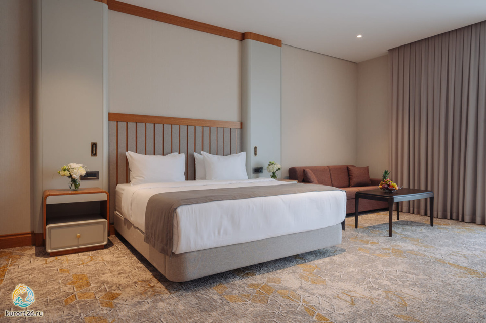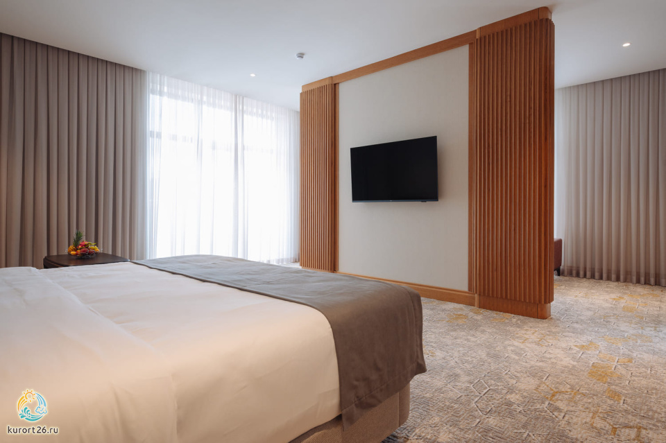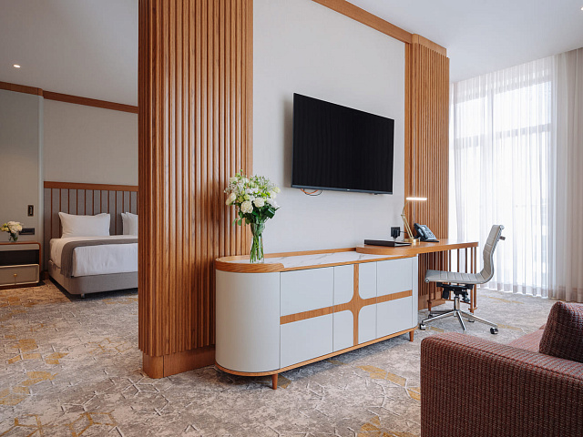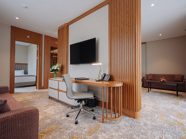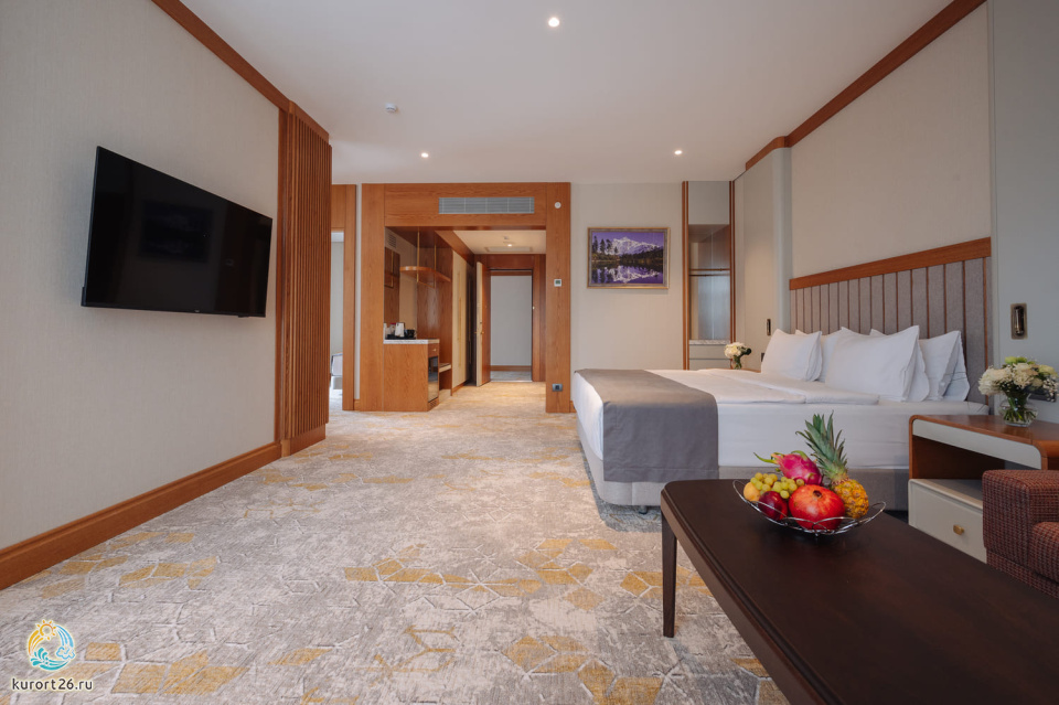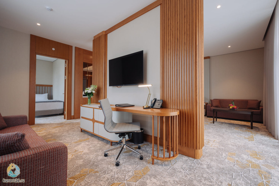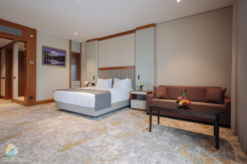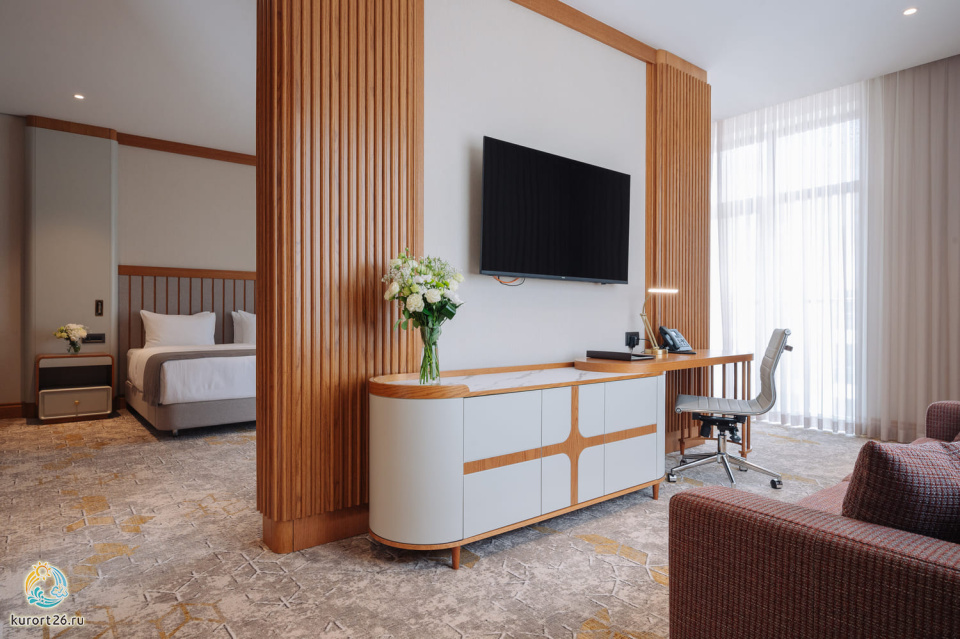 телевизор, фен, набор чайной посуды, балкон, сейф, телефон, мини-бар, халат, тапочки, диван, электрочайник, зеркало, система климат-контроля, журнальный столик, двуспальная кровать с ортопедическим матрасом, Рабочая зона с письменным столом и удобным стулом, Туалетный столик, Душевая кабина, Гигиенический душ, Банные принадлежности, Гостиничная парфюмерия