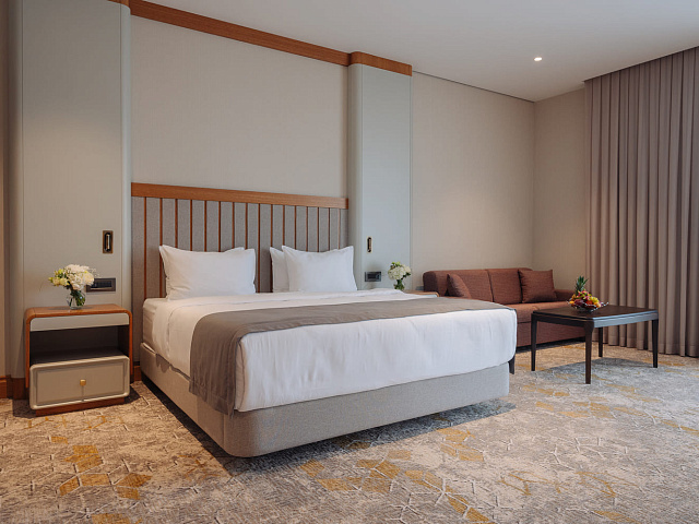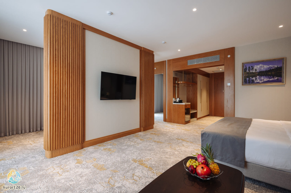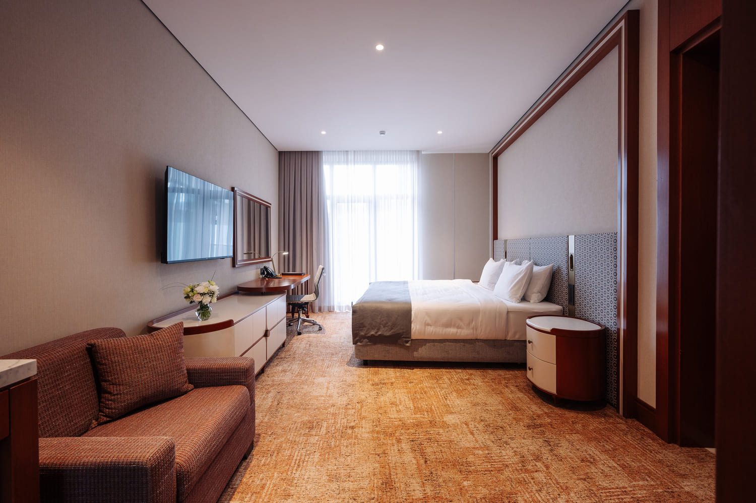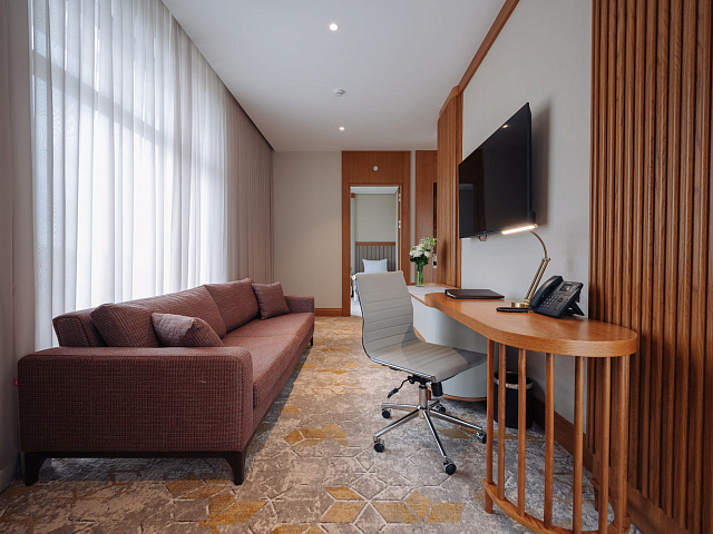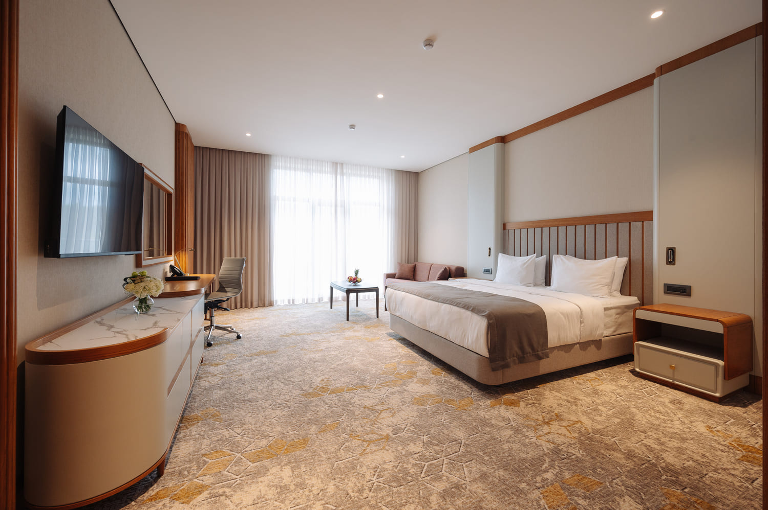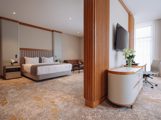 телевизор, фен, набор чайной посуды, балкон, сейф, телефон, мини-бар, халат, тапочки, диван, электрочайник, зеркало, система климат-контроля, журнальный столик, двуспальная кровать с ортопедическим матрасом, Рабочая зона с письменным столом и удобным стулом, Туалетный столик, Душевая кабина, Гигиенический душ, Банные принадлежности, Гостиничная парфюмерия