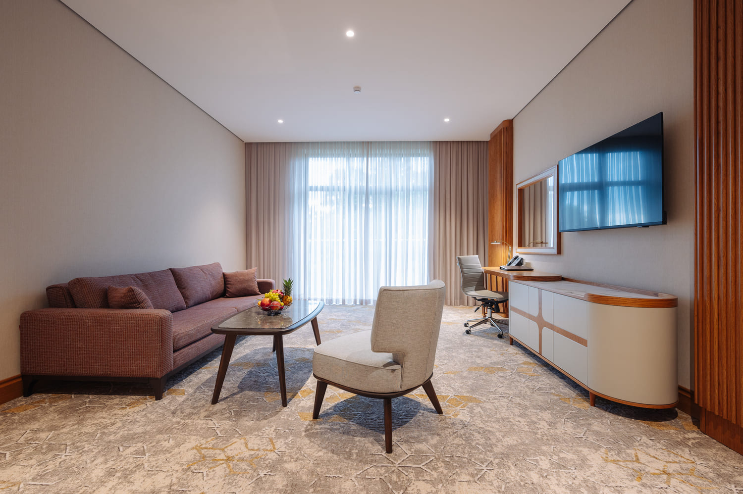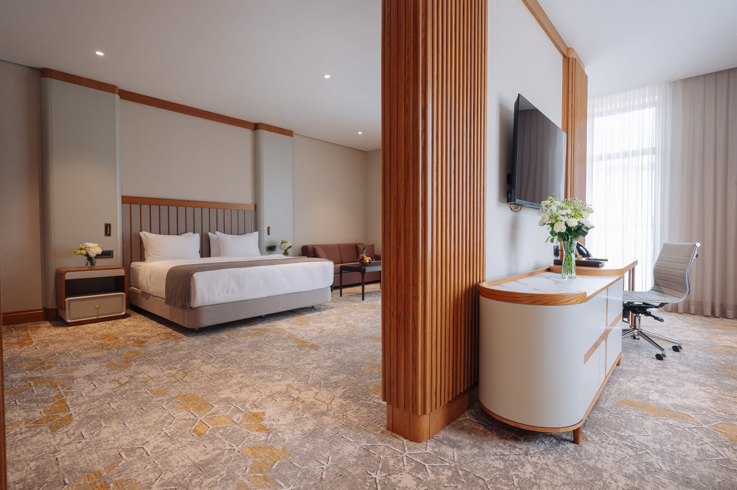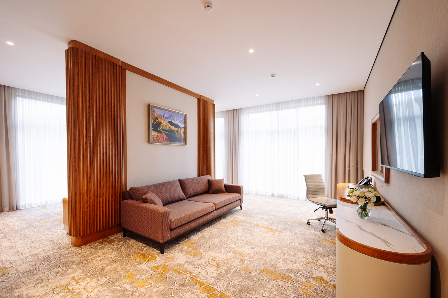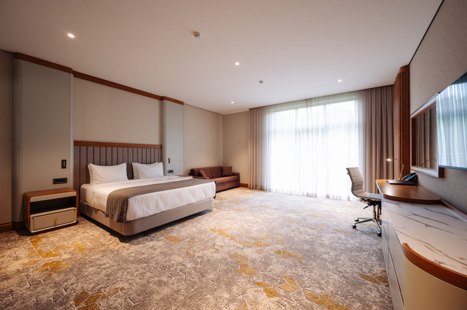 телевизор, фен, набор чайной посуды, балкон, сейф, телефон, мини-бар, халат, тапочки, диван, электрочайник, зеркало, система климат-контроля, журнальный столик, двуспальная кровать с ортопедическим матрасом, Рабочая зона с письменным столом и удобным стулом, Туалетный столик, Душевая кабина, Гигиенический душ, Банные принадлежности, Гостиничная парфюмерия