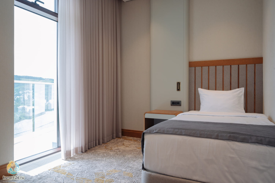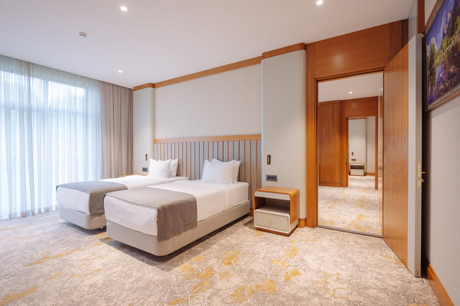 телевизор, фен, набор чайной посуды, балкон, сейф, телефон, мини-бар, халат, тапочки, диван, электрочайник, зеркало, два кресла, система климат-контроля, журнальный столик, двуспальная кровать с ортопедическим матрасом, Рабочая зона с письменным столом и удобным стулом, Туалетный столик, Душевая кабина, Гигиенический душ, Банные принадлежности, Гостиничная парфюмерия, 2 односпальные кровати с ортопедическим матрасом
