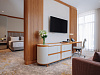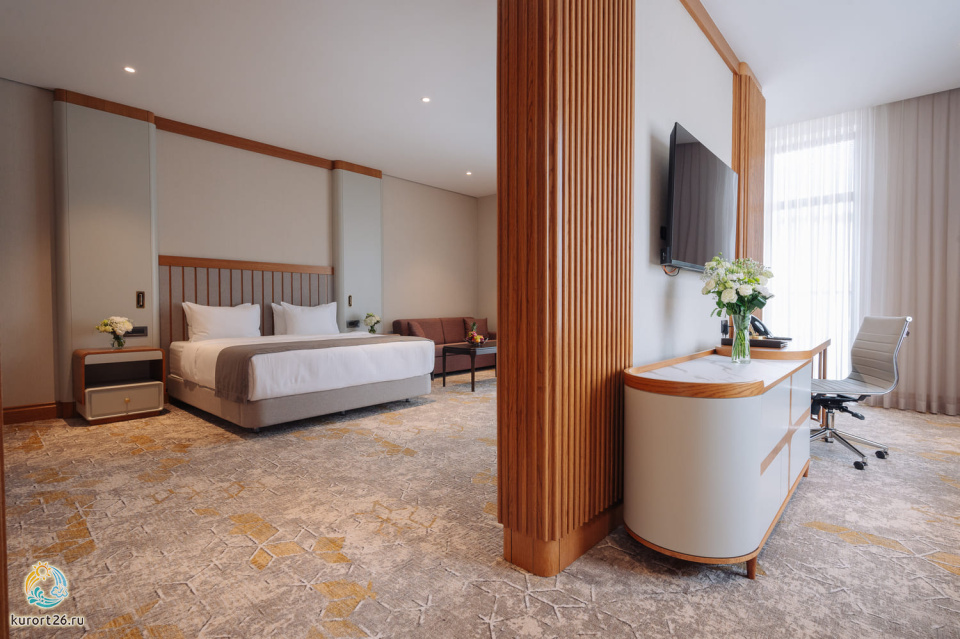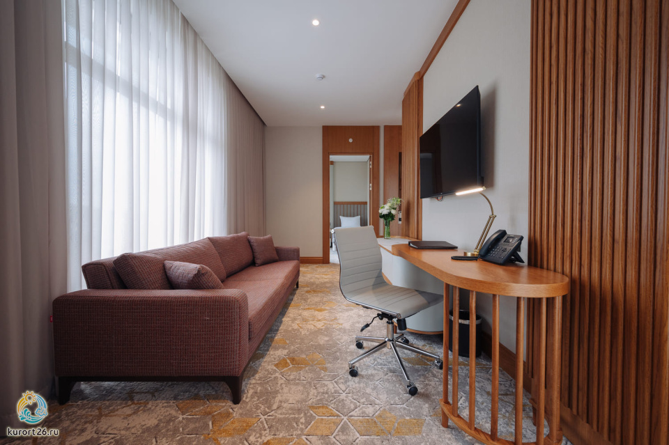 телевизор, фен, набор чайной посуды, балкон, сейф, телефон, мини-бар, халат, тапочки, диван, электрочайник, зеркало, кресло, система климат-контроля, журнальный столик, двуспальная кровать с ортопедическим матрасом, Рабочая зона с письменным столом и удобным стулом, Туалетный столик, Душевая кабина, Гигиенический душ, Банные принадлежности, Гостиничная парфюмерия