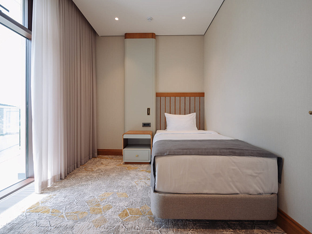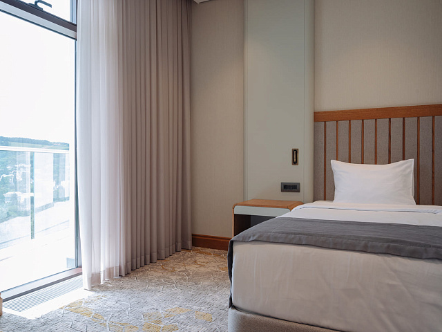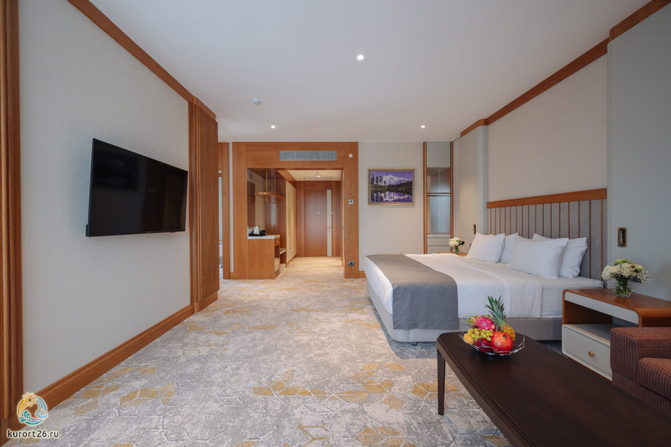 телевизор, фен, набор чайной посуды, балкон, сейф, телефон, мини-бар, халат, тапочки, электрочайник, зеркало, Рабочая зона с письменным столом и удобным стулом, Система климат-контроль, Туалетный столик, Душевая кабина, Гигиенический душ, Банные принадлежности, Гостиничная парфюмерия, 1 двуспальная кровать в DBL или 2 односпальные с ортопедическим матрасом в TWIN, гардеробная комната, раскладной диван в DBL или раскладное кресло в TWIN