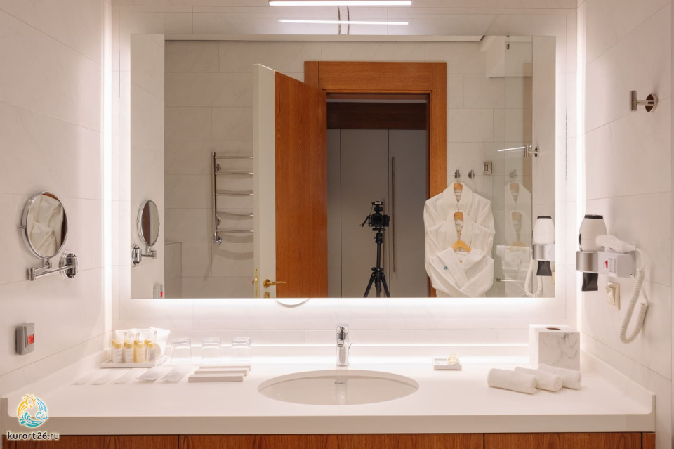 фен, набор чайной посуды, балкон, сейф, телефон, мини-бар, халат, тапочки, диван, электрочайник, зеркало, кресло, два телевизора, система климат-контроля, журнальный столик, двуспальная кровать с ортопедическим матрасом, Рабочая зона с письменным столом и удобным стулом, Туалетный столик, Душевая кабина, Гигиенический душ, Банные принадлежности, Гостиничная парфюмерия