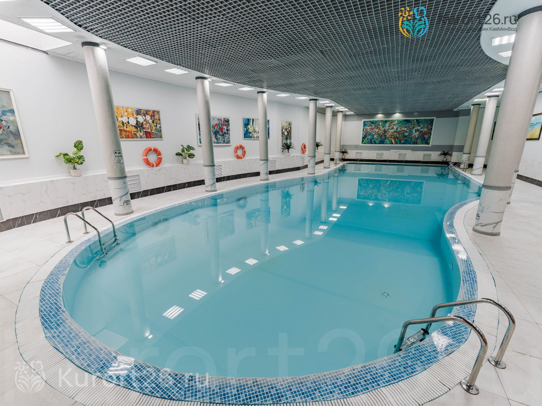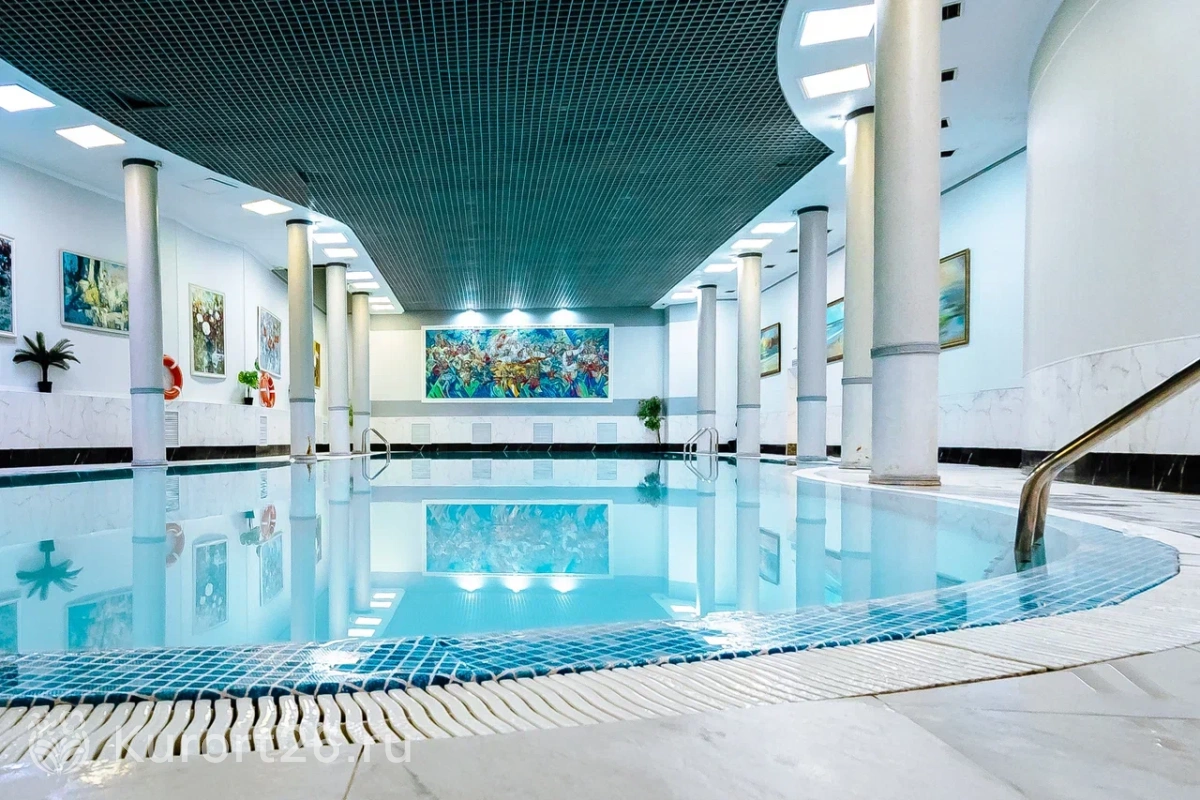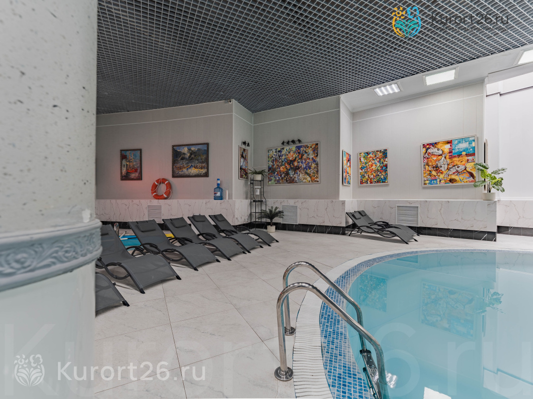- Бассейн 22×8 метров (глубина — 1,30–2,4 м) с многоуровневой системой очистки воды. Термальная зона: финская сауна, турецкий хаммам, купель. Бесплатный фитобар с травяными чаями. Посещение акватремальной зоны включено во все виды путевок (1 час каждый день)