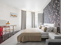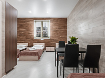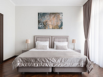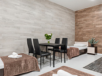 холодильник, кондиционер, фен, балкон, интернет в номере, ванные принадлежности, тапочки, двуспальная кровать, обеденный стол, диван, мини-кухня, три телевизора, набор полотенец, Душевая кабина