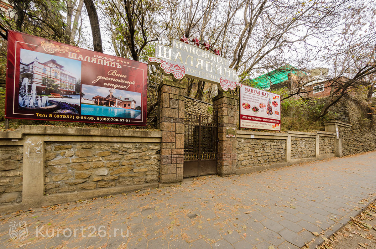 Пансионат «Шаляпин» предназначен для истинных ценителей классики и безупречности во всем. Изысканные архитектурные здания пансионата, окруженные многовековыми деревьями, раскинулись в одном из самых живописных уголков Кисловодска — неподалеку от литературно-музыкального музея «Дача Шаляпина», в пятидесяти метрах от Курортного парка. Таким образом, расположение пансионата «Шаляпин» благоприятствует полноценному отдыху.