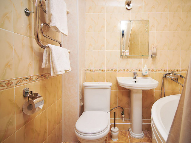 холодильник, кондиционер, телевизор, набор чайной посуды, ванные принадлежности, односпальная кровать, электрочайник, прикроватная тумба, ванная комната